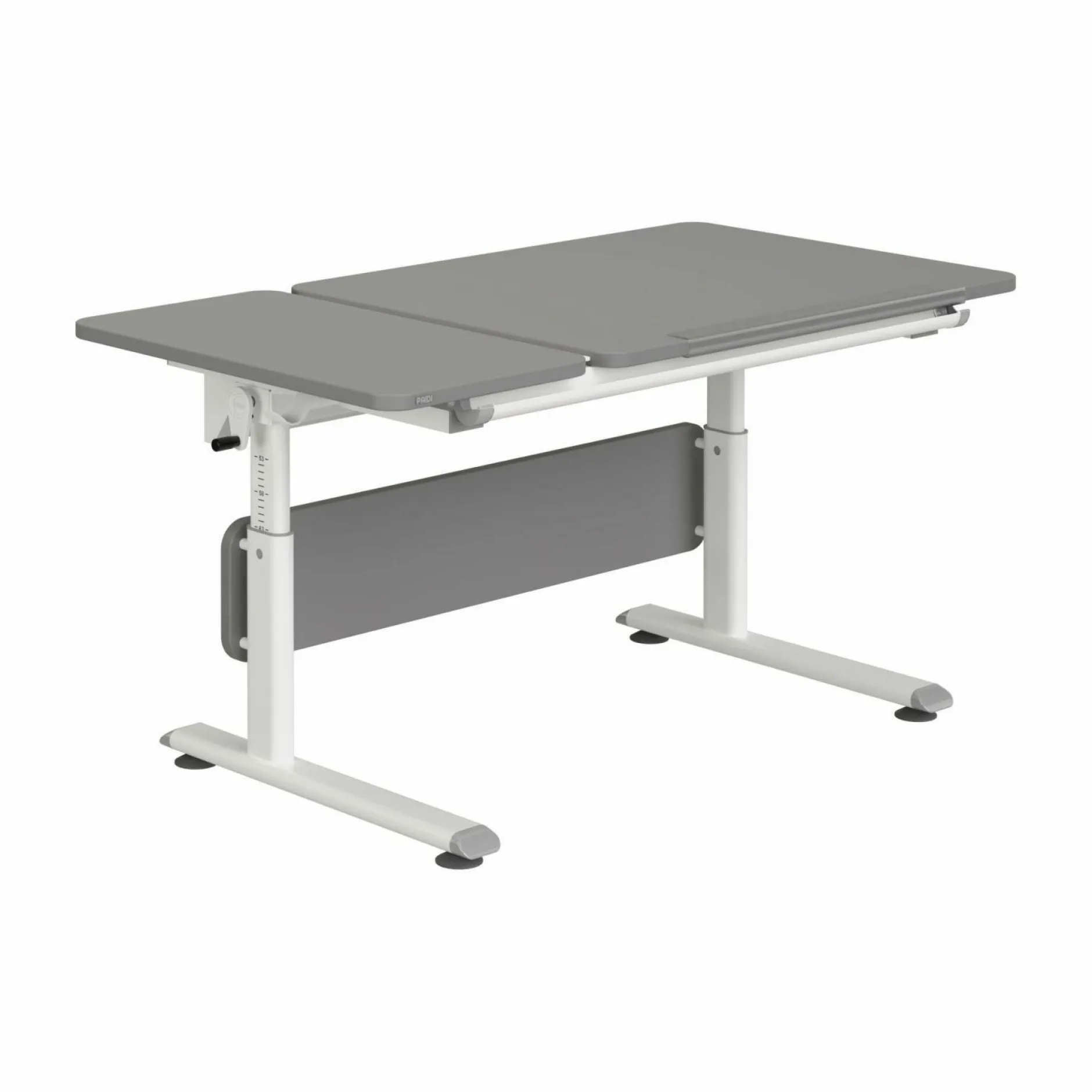 Der Schreibtisch Diego 130 GT aus dem Hause PAIDI verbindet ergonomisches Lernen mit einem schicken Design, welches sich wunderbar in nahezu jeden Einrichtungsstil integrieren lassen wird. Die schrägstellbare Tischplatte ist schiefergrau und lässt sich in einem Bereich bis 19° durch eine hochwertige Raster-Schere verstellen. Das Schreibtischgestell ist in einem weiß gehalten und rundet das Design perfekt ab. Durch die Kurbel lässt sich der Tisch von 53 cm bis 79 cm individuell höhenverstellen und ermöglicht somit bequemes Lernen. Die Tischplatte ist zudem mit einem praktischen 60 cm Lineal, einer Ablagemulde und Taschenhaken ausgestattet.
