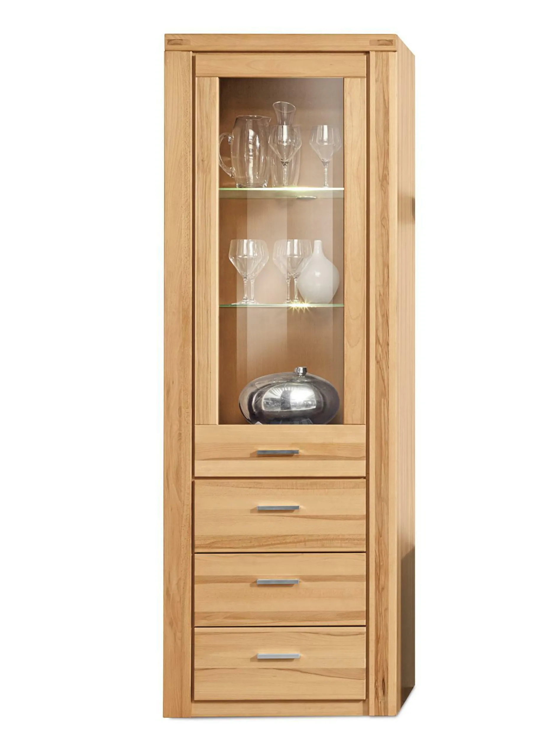 Eine gelungene Kombination, die Natürlichkeit mit modernen Ansprüchen vereint – Wohnwand Tabea. Das schicke Wohnprogramm setzt sich aus einer Vitrine (BHT 66/220/40 cm) mit einer Glas-/Holztür und drei Schubkästen, einem Lowboard (BHT 135/51/40 cm), und einem Regal (BHT 66/140/40 cm), ausgestattet mit drei offenen Fächern und zwei Schubkästen, zusammen. Die edle Holzstruktur der massiven und geölten Fronten aus Kernbuche verleiht Ihrem Wohnbereich eine warme und gemütliche Atmosphäre. Die passende Beleuchtung, Trafo und das ergänzende Wandboard sind gegen Aufpreis erhältlich.