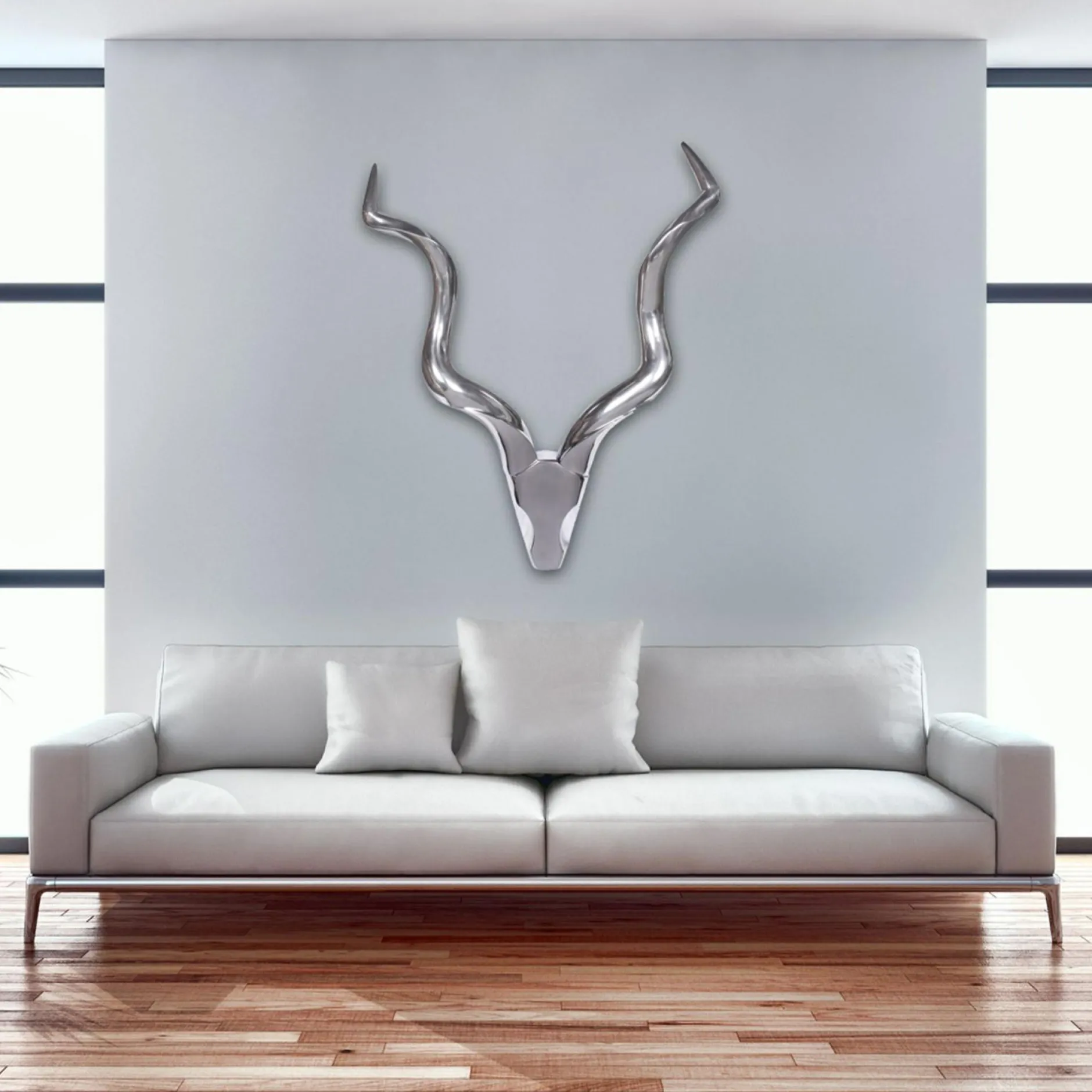 · Abstrakt – Durch die besondere Formgebung der Wanddekoration entsteht die Kontur eines Hirschkopfes.