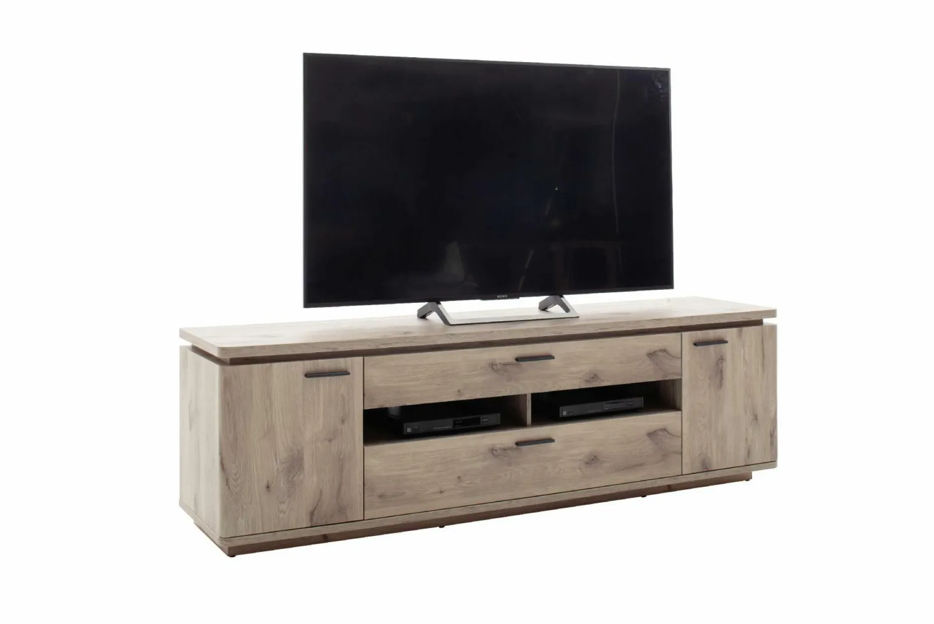 Das Lowboard MARSEILLE der Trendmarke HARPER überzeugt mit einem modernen und zugleich zeitlosen Design. Das Lowboard verfügt über zwei leichtgängige Türen, zwei offene Fächer, sowie drei gedämpfte Schubkästen und bietet somit vielseitigen Stauraum. Der Korpus und die Front erscheinen in robustem Dekor in der Ausführung Viking Oak. Eine Absetzung aus anthrazitfarbigem Dekor, sowie die sichtbare Rückwand in der Ausführung Viking Oak Dekor in sandgestrahlter 3D Eichenholzoptik bieten einen stilvollen Kontrast. Eine stimmungsvolle Oberbodenbeleuchtung ist inklusive. Auf Wunsch ist eine passende Funkfernbedienung erhältlich. Das Lowboard bietet Platz für einen Fernseher bis zu einer Größe von 80 Zoll.
