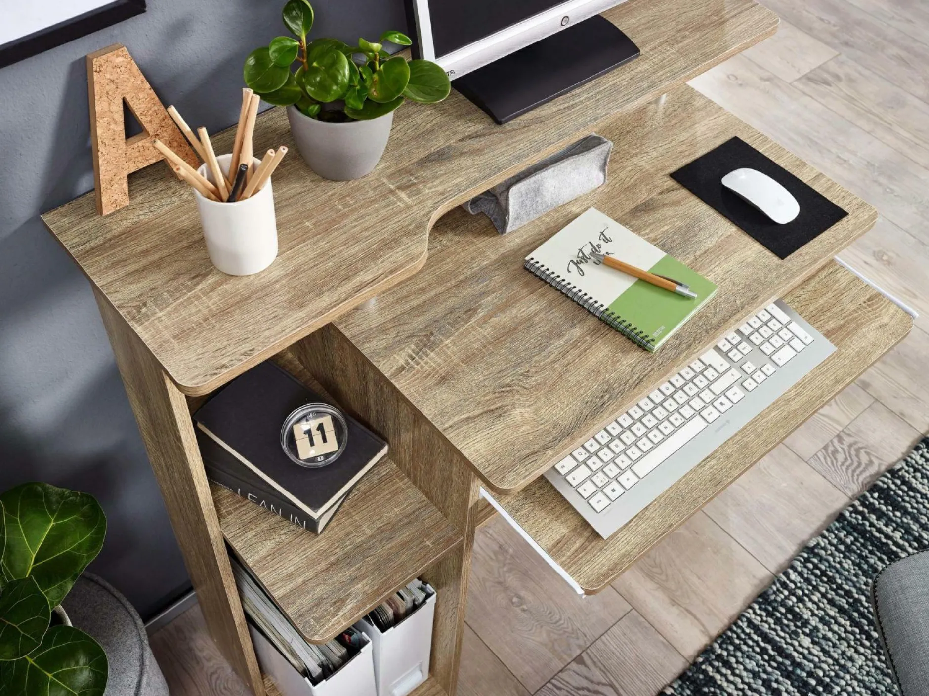 · Lieferumfang und Montage – Geliefert wird ein Computertisch ohne Dekoration. Montageanleitung, Montagematerial und -werkzeug werden mitgeliefert.