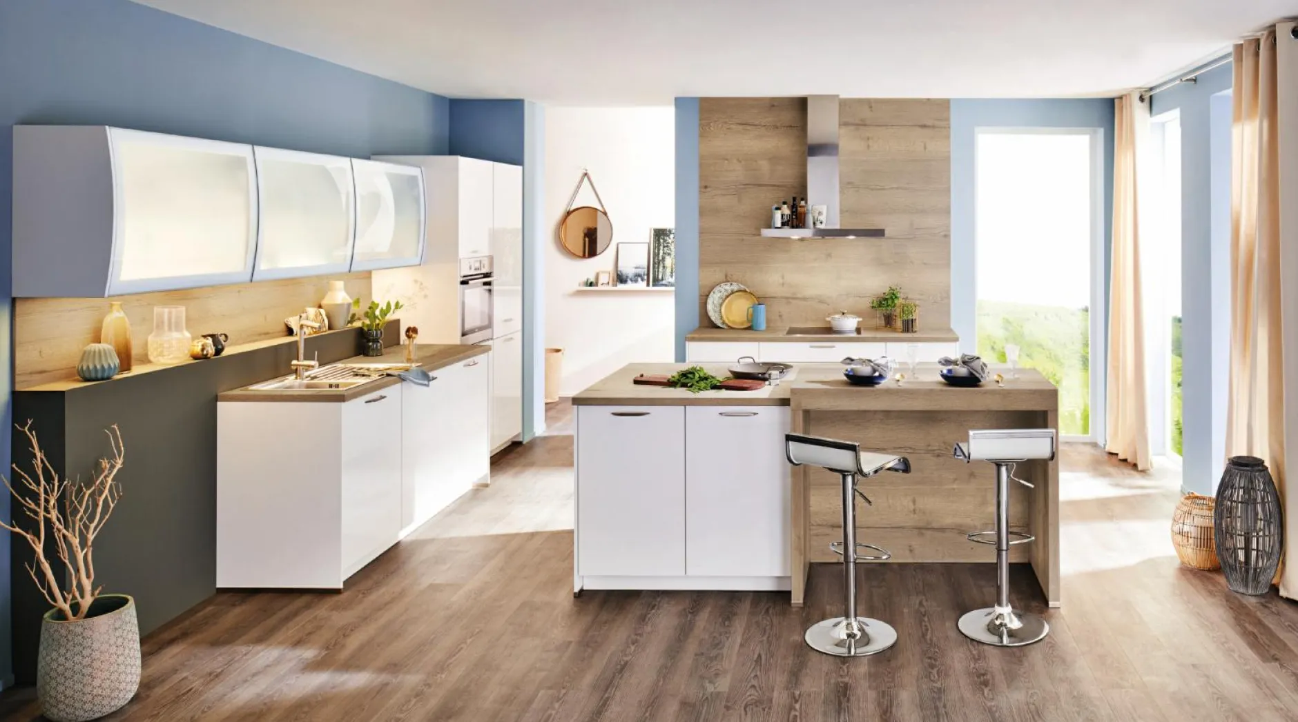 · 3 x Wandschrank, Schwingklappe, Bombierte Segment Glasfront