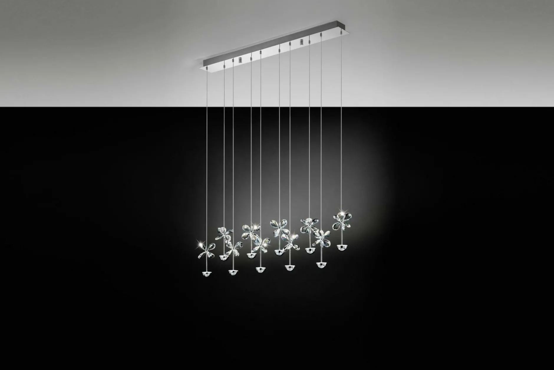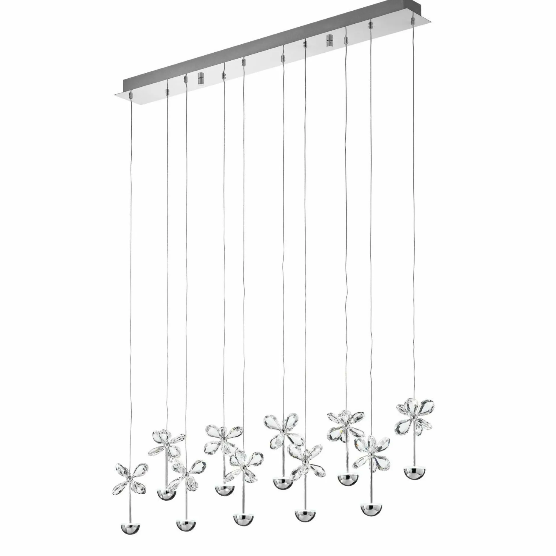 Als exklusives Element für Ihren Wohnbereich präsentiert sich die Hängeleuchte PIANOPOLI von EGLO. Diese formschöne Leuchte aus Chrom und Edelstahl präsentiert sich im avantgardistischen Stil. Mit unterschiedlich langen Hängern aus Kristall in Blumen- und Halbkreisform in einer Reihe wird das Licht besonders darin reflektiert. So erscheint Ihr Wohn- oder Essbereich in ganz besonderem Licht.