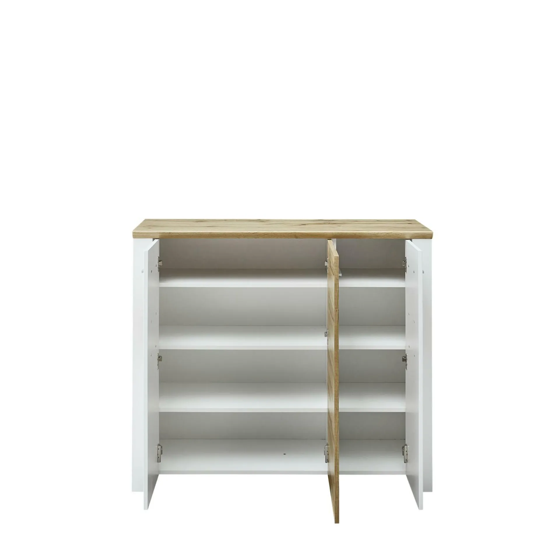 Die Kommode Materio aus dem Hause vito besticht mit einem wohnlichen, aber dennoch schicken Design. Die Anrichte kommt mit einer Front aus Lack Laminat in weiß supermatt, sowie einem Korpus in matt weiß. Um das Design perfekt aufzulockern, ist das Sideboard mit Absetzungen aus Hirnholz Nachbildung und Absetzungen aus Eiche Altholz Nachbildung versehen. Die matten chromfarbige Kunststoffgriffe runden das Design perfekt ab. Die Kommode kommt mit drei Türen mit Softclose-Funktion und insgesamt acht Einlegeböden.