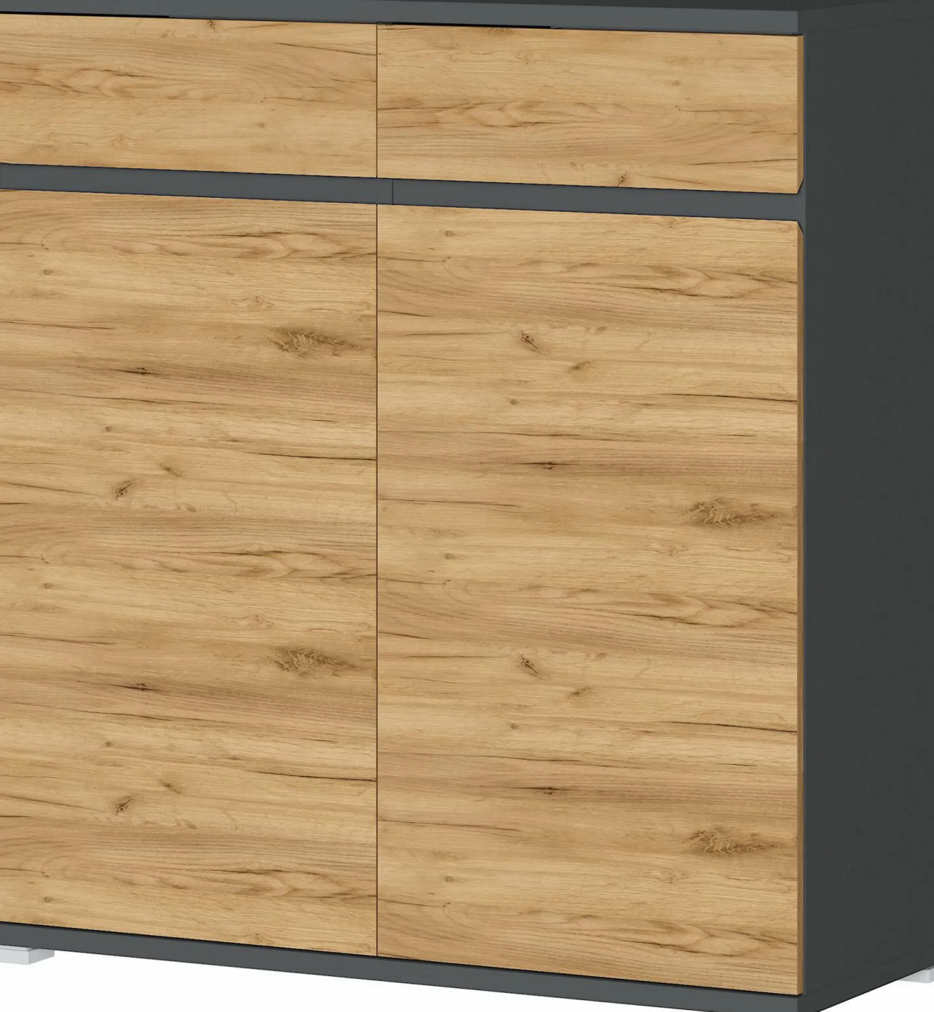 Der Schuhschrank Gent aus dem Hause HARPER ist der ideale Begleiter für eine aufgeräumte Garderobe. Das schicke Design wertet jedes Wohnkonzept wunderbar auf. Die Front ist aus Navarra Eiche Nachbildung gefertigt und wird durch Applikationen in anthrazit kontrastiert. Das grifflos Design verleiht der Kommode einen schicken Touch. Die Anrichte ist mit zwei Schubladen und zwei gedämpften Türen ausgestattet, hinter denen sich vier verstellbare Einlegeböden befinden. Für einen sicheren und stabilen Stand sorgen Kunststofffüße.