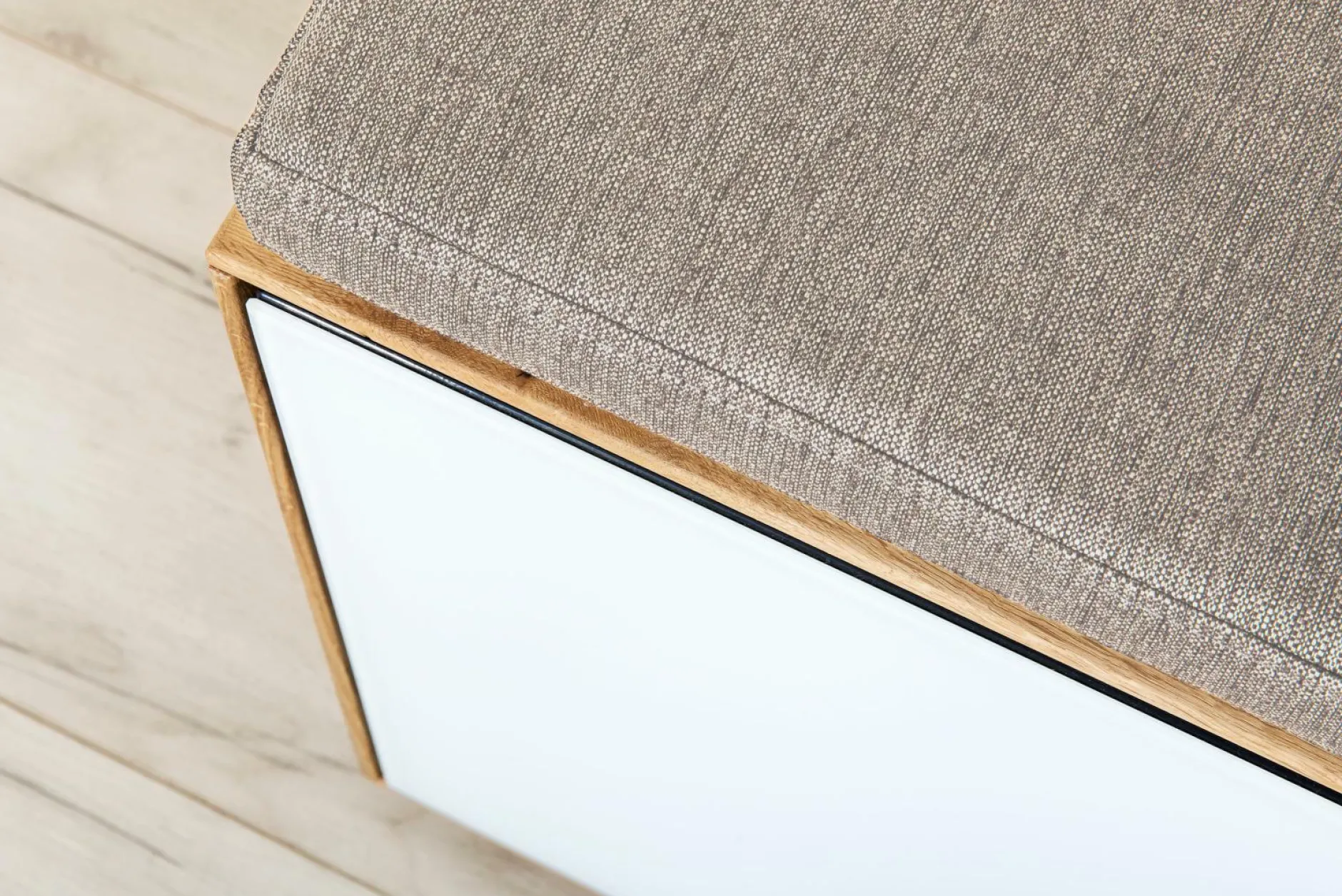 Korpus astige Eiche, naturbelassen geölt durchgehende Lamelle Front Glas matt weiß, Appl. Strukturele- mente Eiche naturbelassen geölt links Tür mit Fachboden, durch Lochrei- henbohrung verstellbar, rechts Klappe mit Fachboden mittig gesetzt Polsterauflage auf Wunsch
