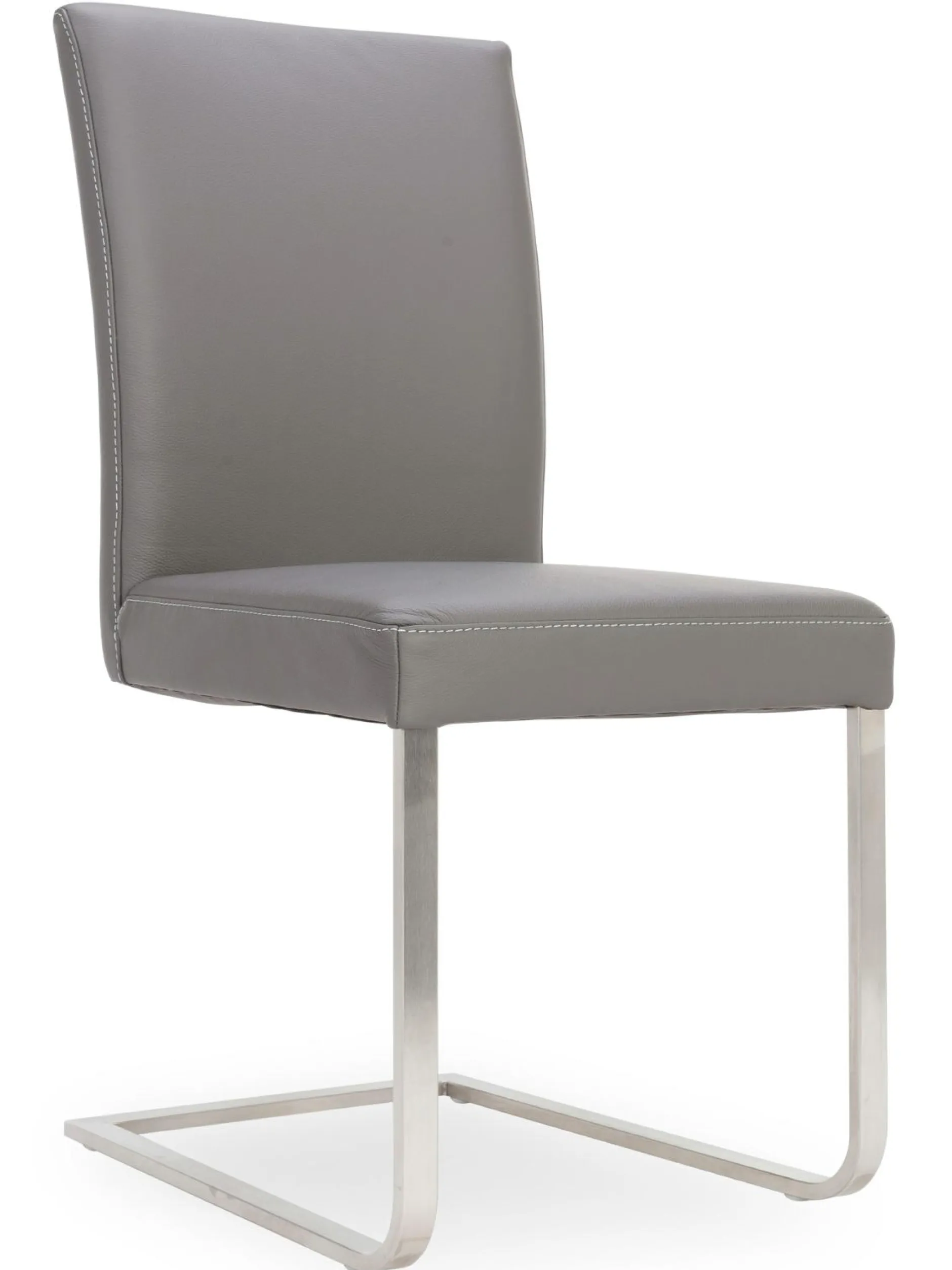 Der Freischwinger Match von variano besticht durch einen schönen Lederbezug in grauer Farbe und einem stabilen Edelstahlfußgestell in Rechteckrohrform. Trendige Akzente im Essbereich setzt dieser bequeme Stuhl. Der Oberteil der Sitzgelegenheit ist glatt und geschlossen und unterstützt einen hohen Sitzkomfort durch die leicht gebogene Fläche.