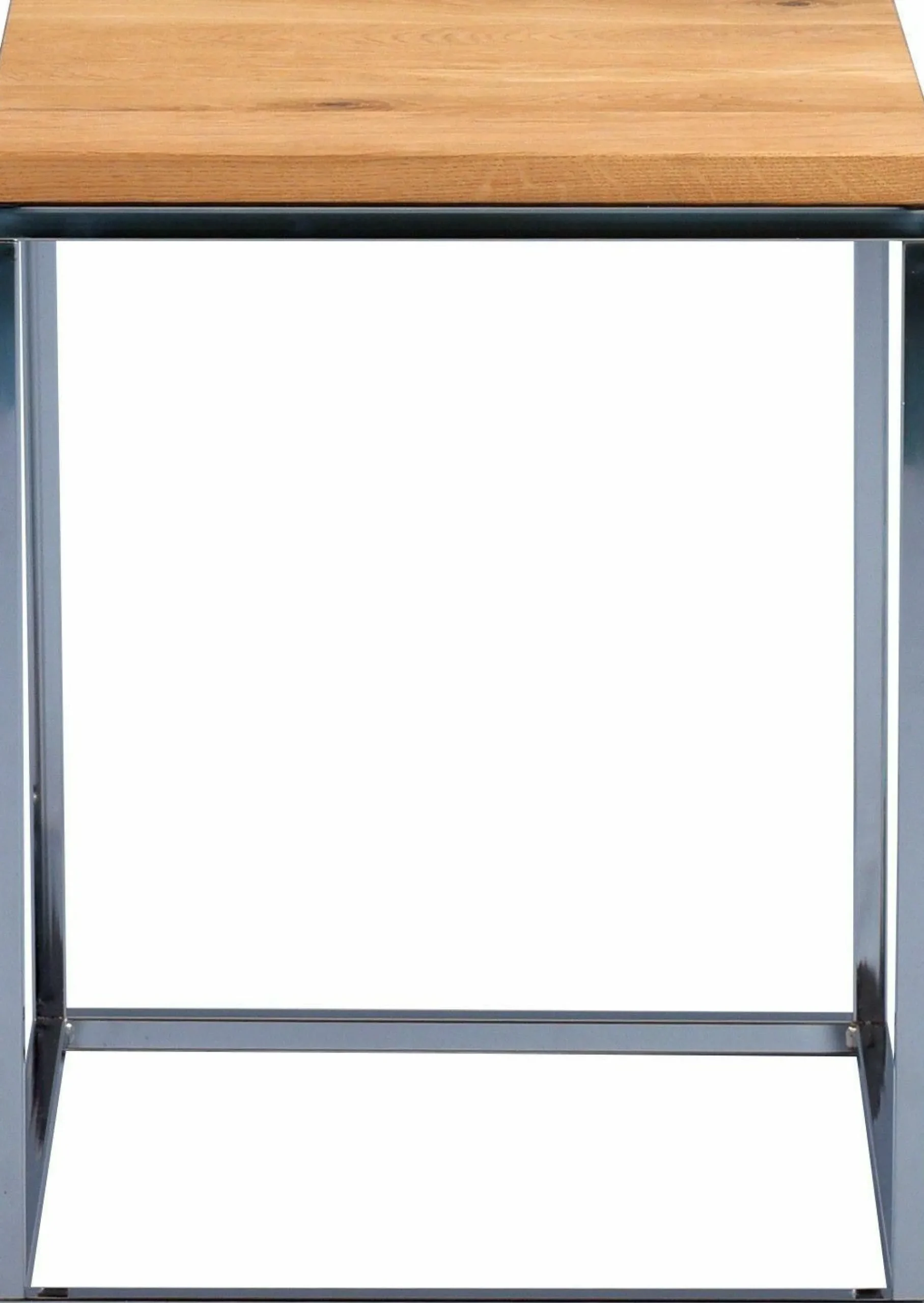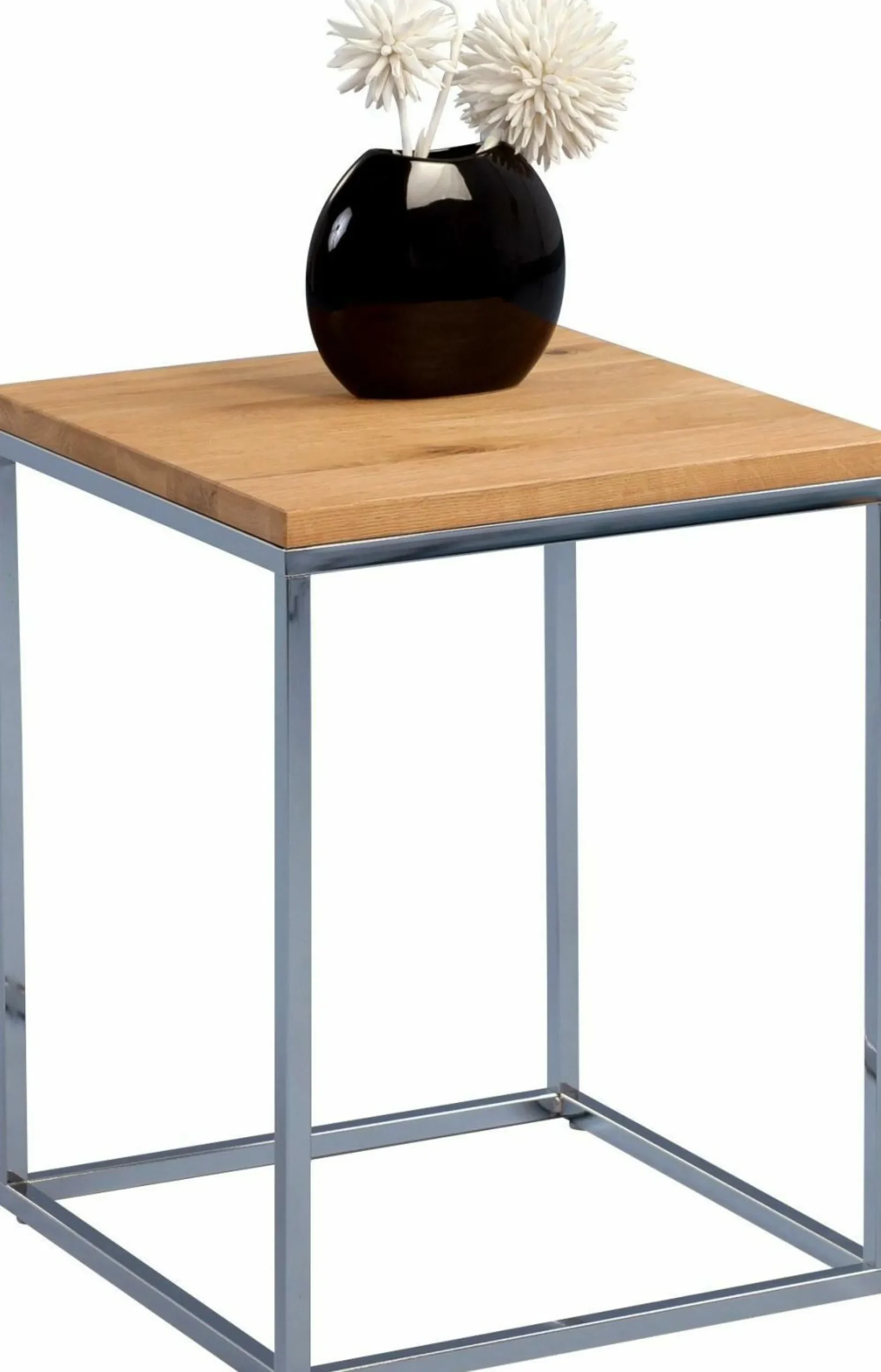 Der Beistelltisch stellt eine super schicke, kleine und praktische Ablagefläche für Ihr Wohnzimmer dar. Bei diesem Tisch besteht die Deckplatte aus massiver Wildeiche und das Gestell ist aus Metall in Edelstahloptik gefertigt. Dank der kleinen Tischplatte erhalten Sie eine nützliche Abstellfläche für Dekoration, Getränke oder Snacks. Sowohl durch die Form als auch durch die Farbe präsentiert der Tisch einen zeitlosen und modernen Stil, der in fast jede Einrichtung ideal integriert werden kann.