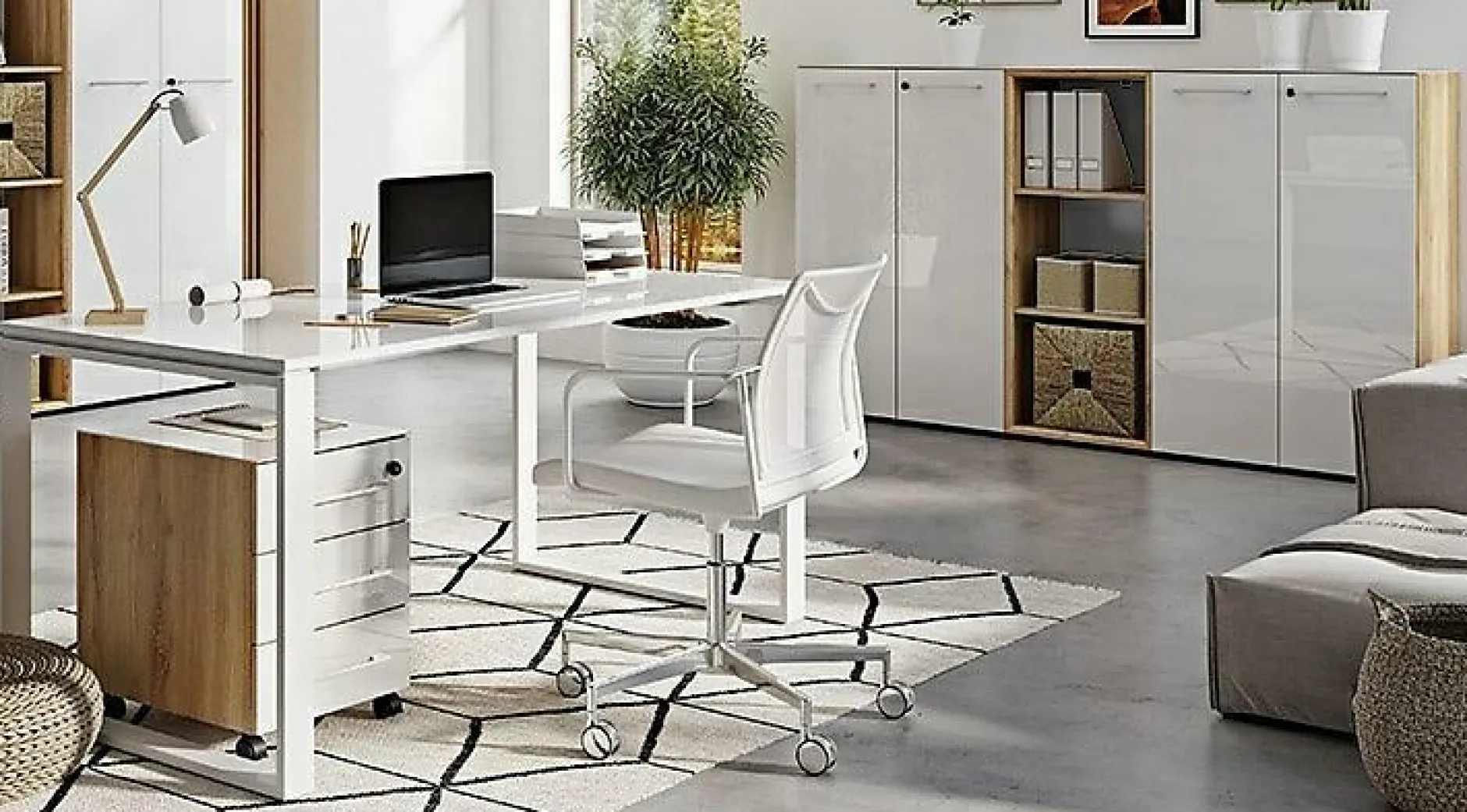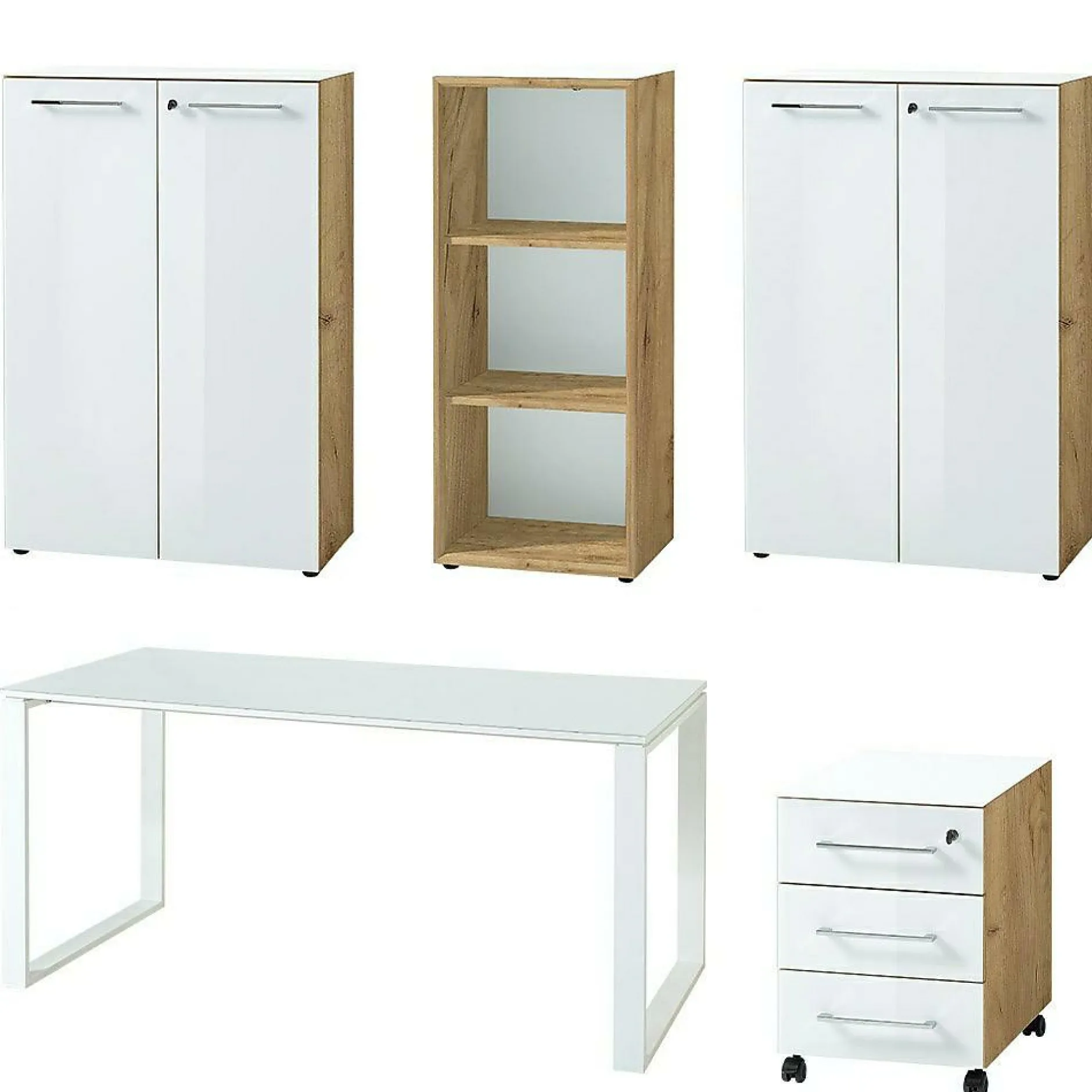 · Set bestehend aus einem Schreibtisch, einem Rollcontainer, zwei Aktenschränken und einem Aktenregal, Schreibtisch mit zwei pulverbeschichteten Metallkufen, Tischplatte belastbar bis zu 30 kg, Rollcontainer mit drei Schubkästen inkl. Selbsteinzug, ein Schubkasten abschließbar, vier Laufrollen – zwei davon mit Feststellbremse, zwei Aktenschränke mit abschließbaren Türen, dahinter je zwei feste Böden, ein Aktenregal mit zwei festen Böden und 3D-Rahmen mit Gehrung MDF-ummantelt, insgesamt sieben Relinggriffe aus Chrom und 12 schwarze Möbelgleiter, Fronten und Oberböden mit Glasauflage, Korpus in Navarra-Eiche-Nb., Glaselemente in Weiß, Türdämpfung, Melaminharzbeschichtung, hochwertige ABS-Kanten, Made in Germany.