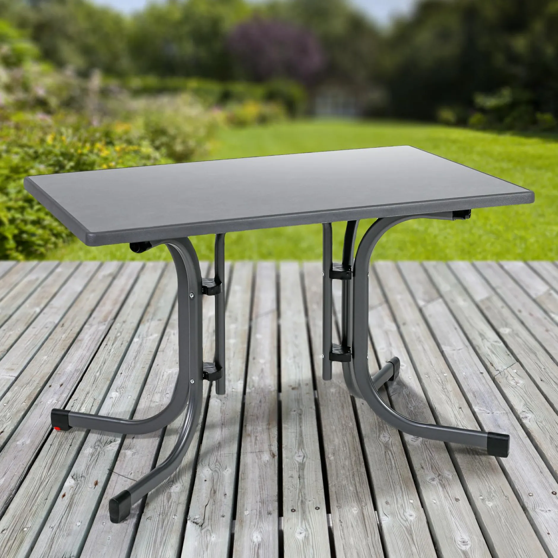· Ein Hit – drinnen wie draußen: Der rechteckige Klapptisch ist der perfekte Begleiter durch die Gartensaison und findet auch in der kalten Jahreszeit Einsatz, zum Beispiel im Wintergarten, im Kreativ- oder Werkraum. Clever: Durch die nützliche Niveauregulierung lassen sich kleinere Bodenunebenheiten bestens ausgleichen, sodass das Möbelstück in der Waage steht. Es kombiniert ein robustes Stahlgestell mit einer anthrazitfarbenen Tischplatte aus MDF. Dank der praktischen Kunststoffbeschichtung verfügt der Tisch über eine hohe Beständigkeit gegen Witterungseinflüsse – perfekt für den Outdoor-Bereich. Mit seiner ca. 115 x 70 cm messenden Tafel ist er für Gruppen von vier bis sechs Personen geeignet. Besonderer Vorteil ist die zweckmäßige Klappfunktion, sodass der Einrichtungsgegenstand platzsparend verstaut werden kann – perfekt, wenn es so gut klappt.