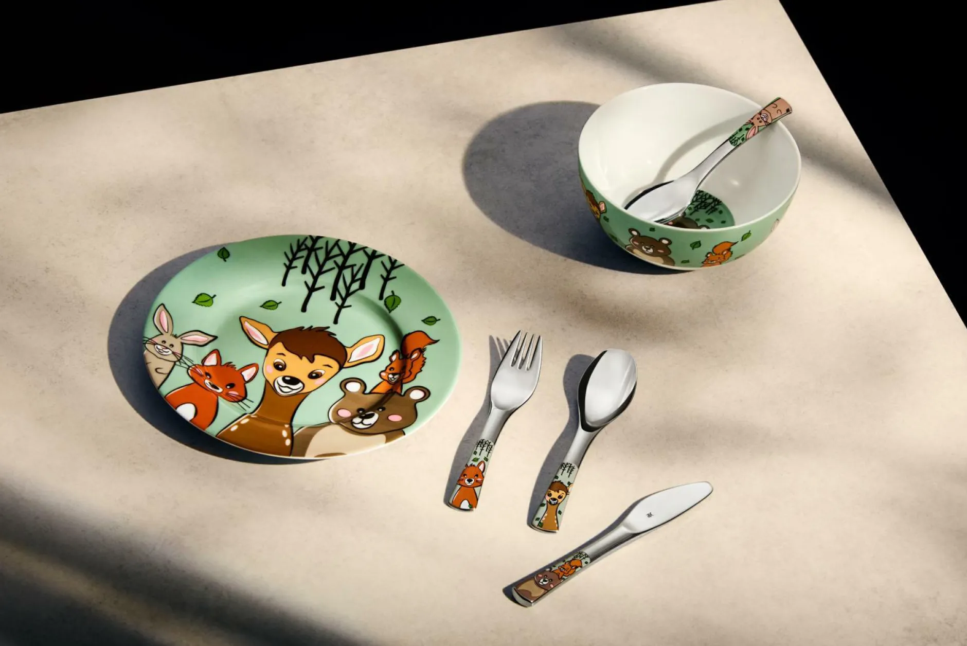 · WMF Kinderbesteck-Set: Kindgerechtes Design Die Waldfreunde von WMF werden die besten Freunde Ihres kleinen Essers sein. Mit diesem kindgerecht gestalteten 4-teiligen Kinderbesteck-Set mit einer ungewöhnlichen Truppe bester Freunde, das die Selbstständigkeit beim Essen fördert soll, wird jede Mahlzeit zu einem Abenteuer. Hirsch, Bär, Fuchs, Hase und Eichhörnchen heißen Ihr Kind liebevoll in ihrer Welt willkommen. Im kompletten Set enthalten sind eine Gabel, ein Messer, einen Löffel, einen kleinen Löffel für Kinder ideal, um die Freude am selbstständigen Essen zu entdecken.