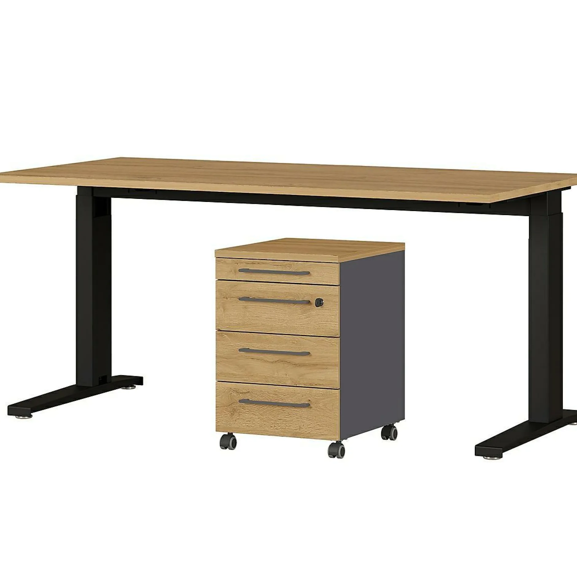 · Büromöbel-Set bestehend aus einem Schreibtisch und einem Rollcontainer, Schreibtisch mechanisch höheneinstellbar mit zwei C-Füßen, Tischplatte (belastbar bis zu 80 kg) in der Farbe Eiche, Gestell aus pulverbeschichtetem Metall in Schwarz, Höhe einstellbar von 68-88 cm, Rollcontainer mit vier Schubladen, oberste Schublade mit Utensilienfach, zweite abschließbar, Oberboden belastbar bis zu 10 kg, Fronten und Oberboden in der Farbe Eiche, Rest in Graphit, vier Bügelgriffe aus Metall in Graphit, vier schwarze Laufrollen, zwei davon feststellbar, Melaminharzbeschichtung, ABS-Kanten, Selbsteinzug der Schubladen, Made in Germany.