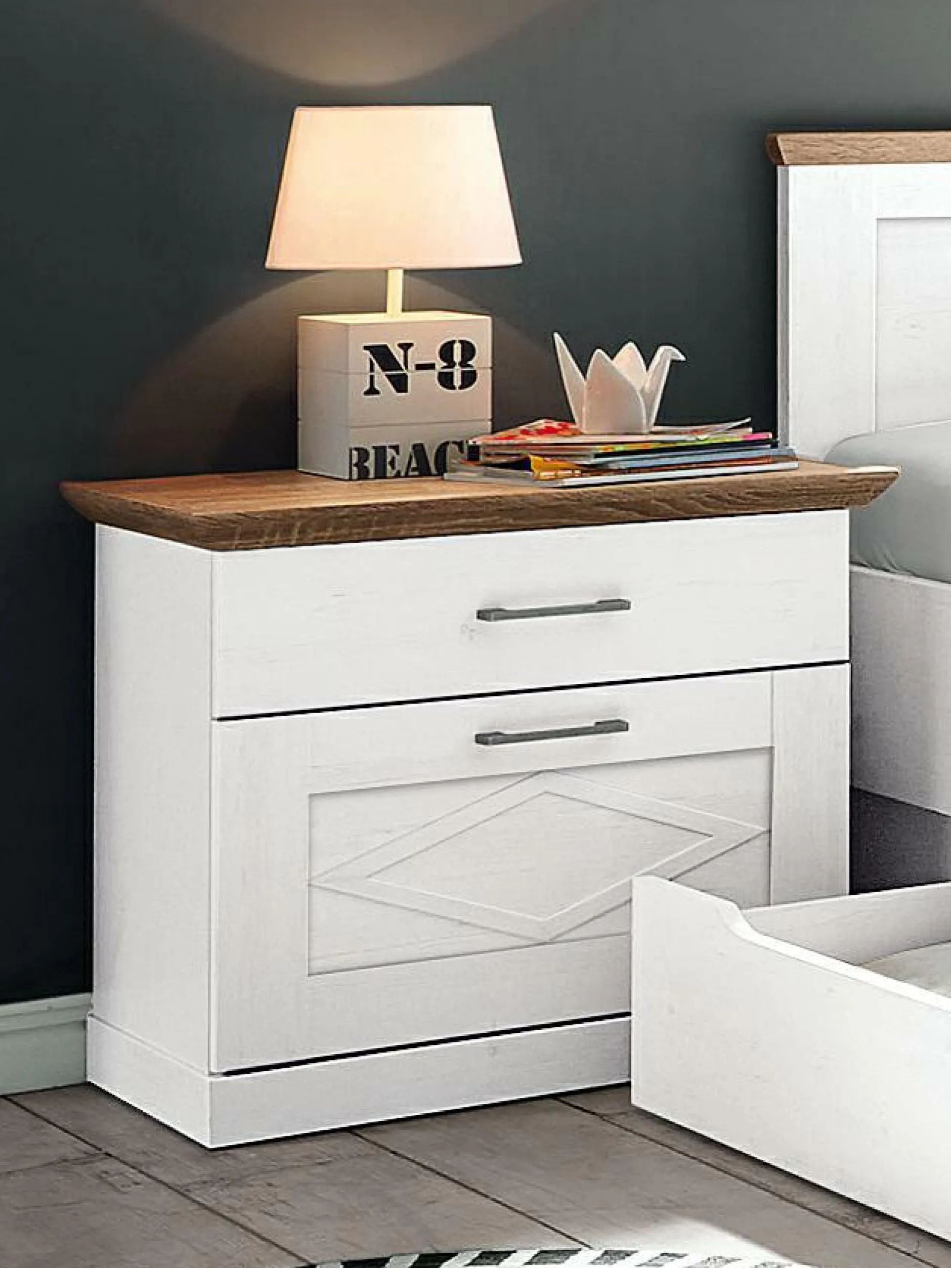 Mit der Nachtkommode Country von vito sorgen Sie für die perfekte Ausgestaltung Ihres Schlafzimmers und bringen zugleich Ihre Utensilien komfortabel unter. Die Anderson-Pinie-Ausführung (Nachbildung) sowie die Trüffel-Absetzung (Nachbildung) zeugen von einer stilbewussten Optik. Die Nachtkommode verfügt über 2 Schubkästen, die überdies mit einer Softclose-Funktion ausgestattet sind.