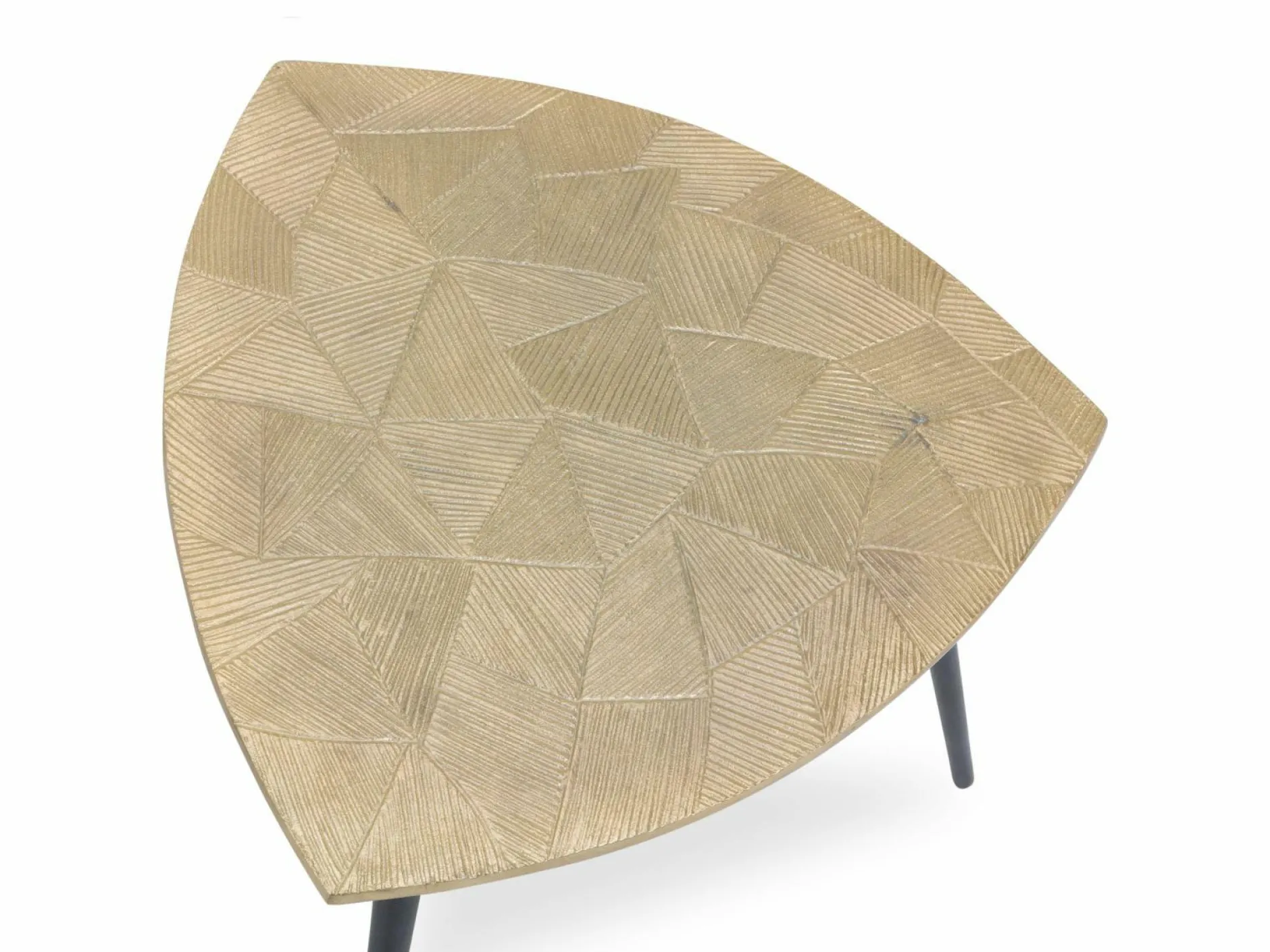 Der Beistelltisch Melly 1 von M2 KOLLEKTION verfügt über eine dreieckige, geschwungene Metallgussplatte in Goldoptik und filigrane, kegelförmige Metallbeine. Die gemaserte, goldfarbige Tischplatte steht in edlem Kontrast zum tiefen Schwarz der Tischbeine und lässt den Tisch in jeder Räumlichkeit zum besonderen Hingucker werden.