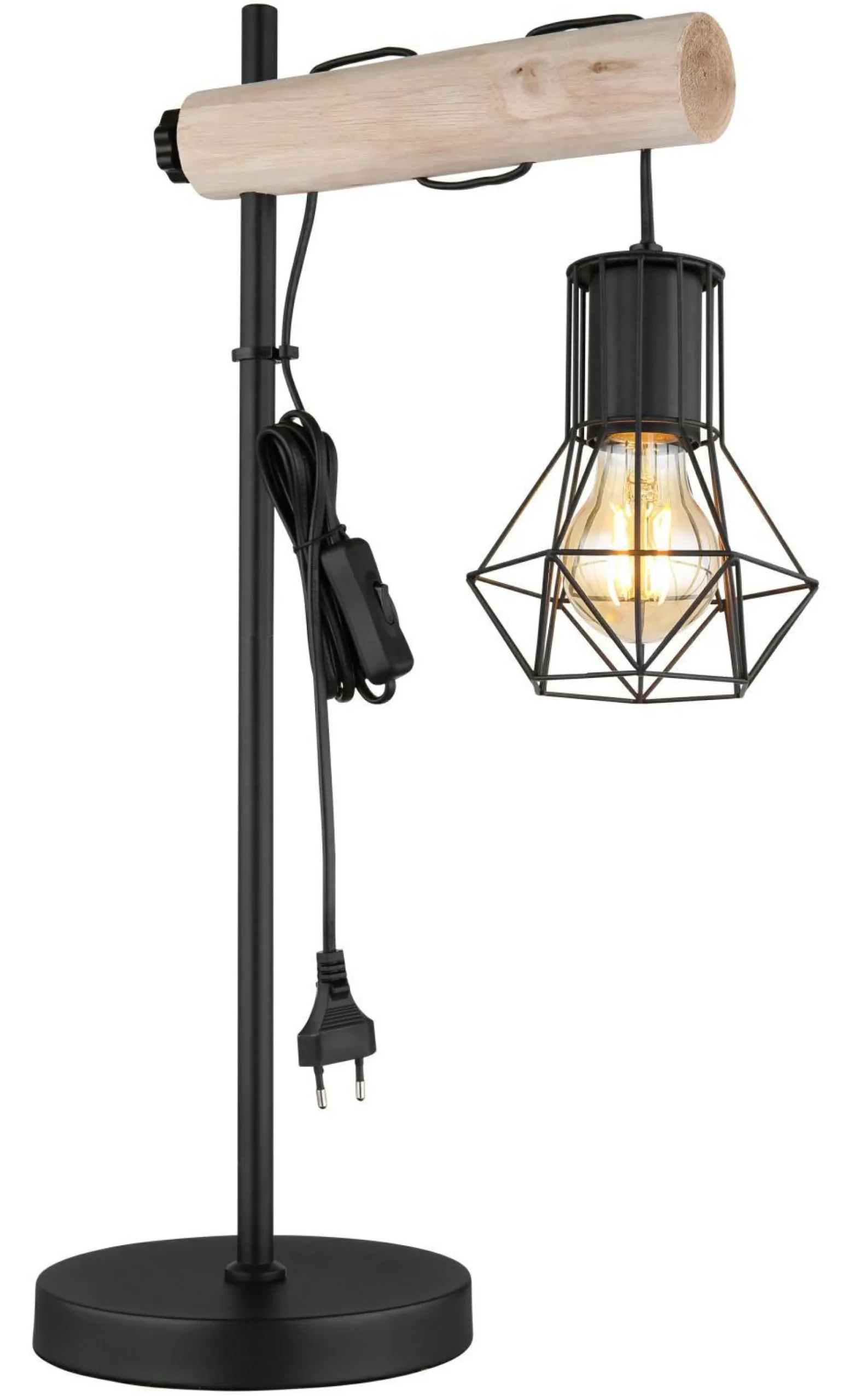 · Diese tolle Tischleuchte begeistert durch schönes Design. Aus einem runden Sockel ragt eine 55 cm lange schwarze Metallstange an der sich ein höhenverstellbarer Holzbalken mit einer E27 Fassung und einen Schirm aus Metallgeflechten befindet. Die E27 Fassung ermöglicht Ihnen bis zu einer maximalen Leistung von 60 Watt selbst über Lichtfarbe und Helligkeit zu bestimmen. Aufgrund von Langlebigkeit und Stromersparnis empfehlen wir LED Leuchtmittel.