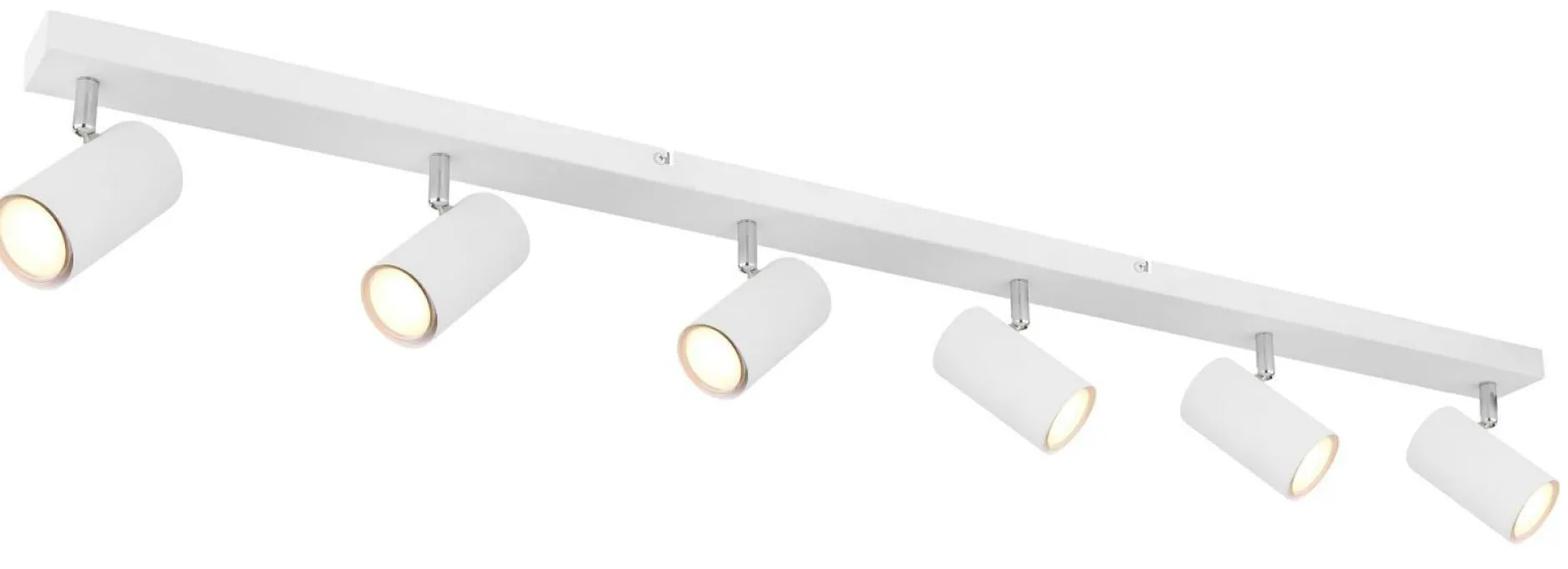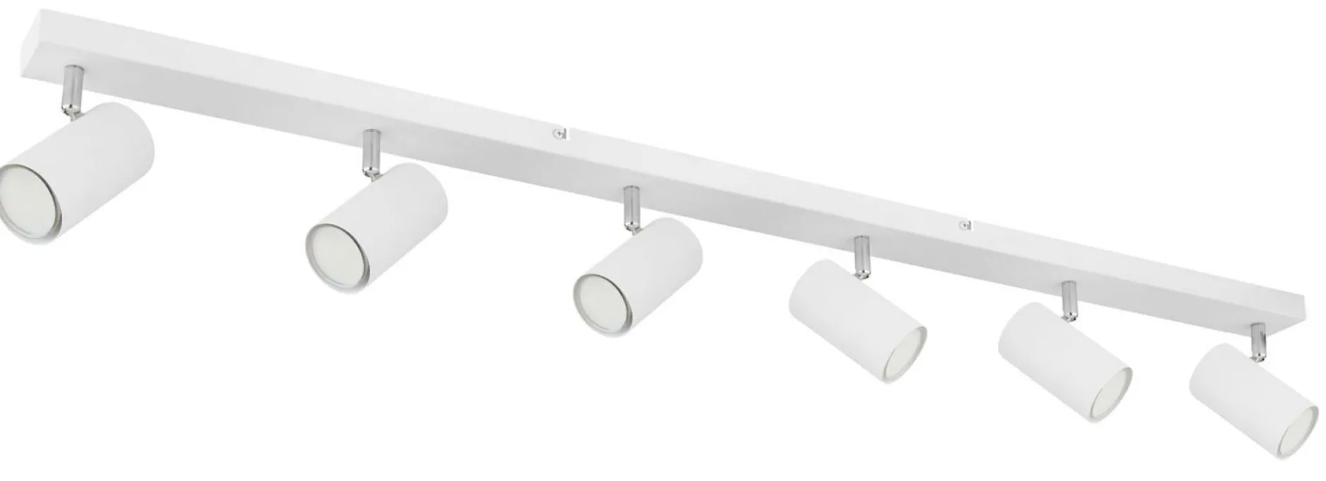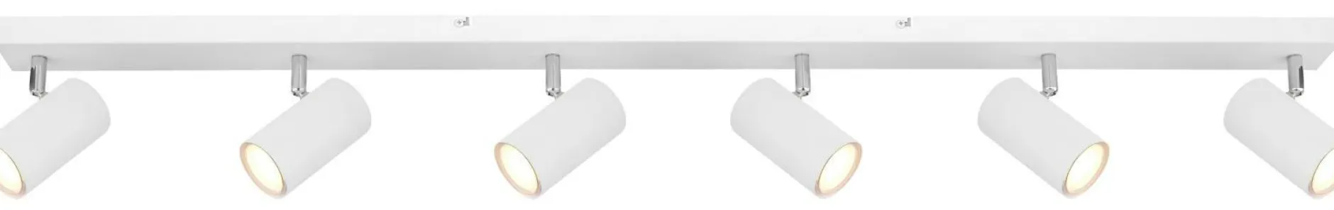 · Dieser schlichte Deckenstrahler aus Metall der Serie Robby besticht durch sein durchgehendes weiß-verchromten Design. Der knapp 1,2m lange Strahler ist mit sechs schwenkbaren GU10 Fassungen ausgestattet. Durch die freie Wahl des Leuchtmittels können Sie selbst, bis zu einer maximalen Leistung von 35 Watt, über Lichtfarbe und Stärke bestimmen. Aufgrund ihrer Stromersparnis und Langlebigkeit empfehlen wir LED-Leuchtmittel.