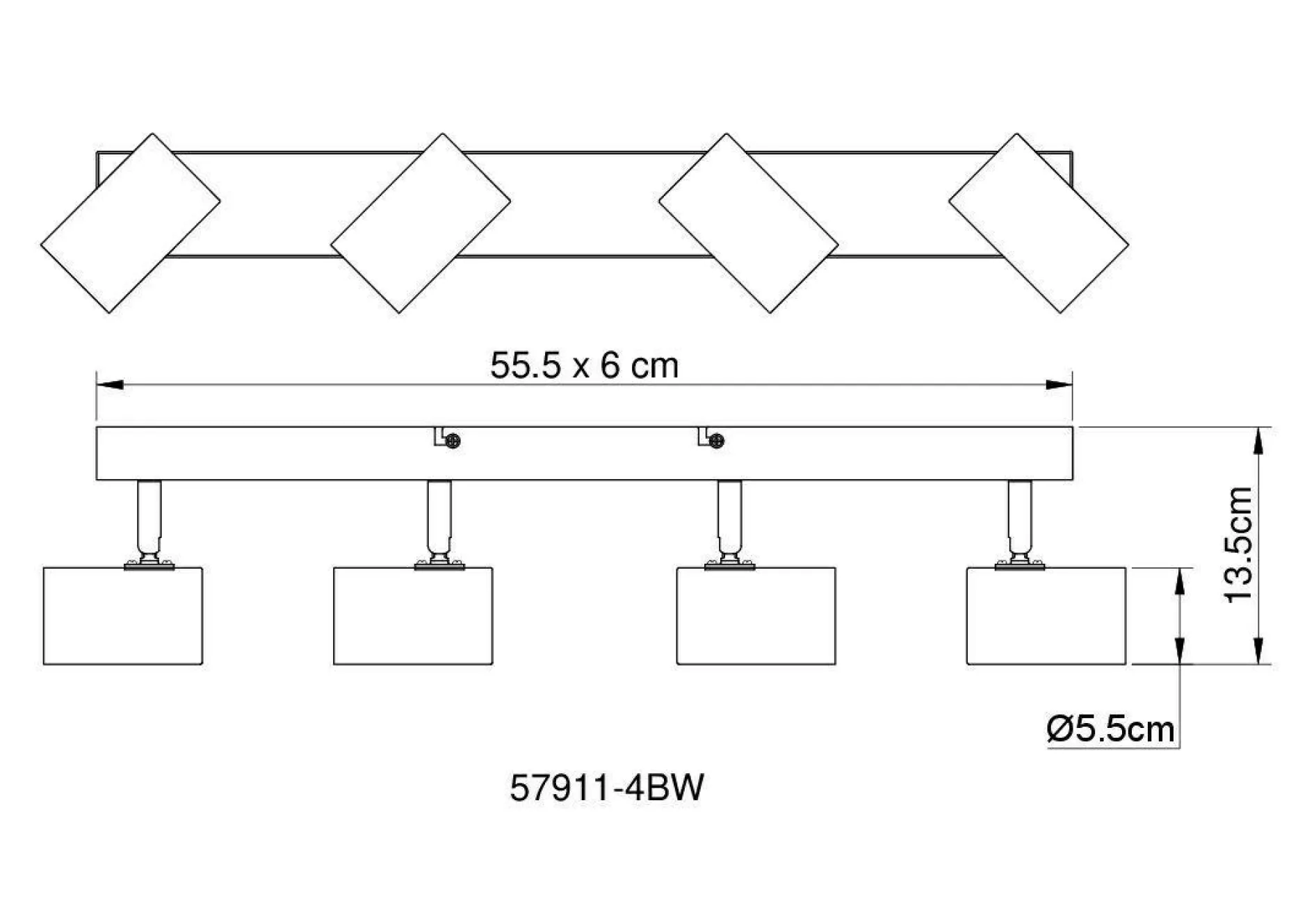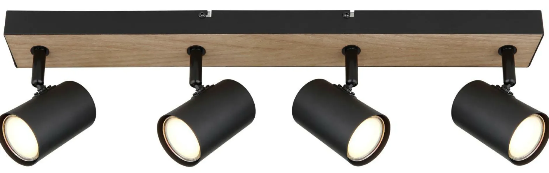 · Dieser schlichte Strahler der Robby Serie begeistert durch Design und Farbgebung. An einer rechteckigen Deckenhalterung aus schwarz matten Metall und MDF in Holzoptik (56 x 6cm) befinden sich vier GU10 Fassungen, bedeckt von jeweils einem zylinderförmigen Schirm. Die GU10 Fassung, ermöglicht Ihnen die freie Wahl an Leuchtmitteln, bis zu einer maximalen Leistung von 35 Watt.
