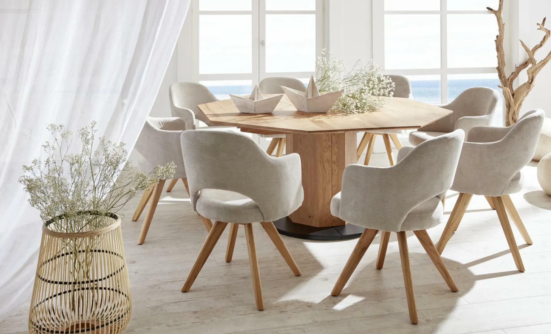 Der Polsterstuhl Tinnum der Marke SANSIBAR LIVING erscheint in einem modernen und extravaganten Design. Inspiriert vom Sylter Lebensgefühl, verwandelt dieses Design Ihren Essbereich in eine eigene Insel der Ruhe und Erholung. Die Sitzfläche und die Rückenlehne sind formschön gestaltet, komfortabel gepolstert und mit dem geschmeidigen Stoff Matrix bezogen. Wählen Sie Ihren Lieblingsfarbton aus zahlreichen eleganten und zugleich natürlichen Bezugsfarben. Das stabile Stativgestell ist aus hochwertigem, massivem Eichenholz gefertigt und steht in edlem Kontrast zum schlichten Sitz. Die Sitzhöhe beträgt 51 cm, die Sitztiefe beträgt 50 cm und die Sitzbreite beträgt angenehme 46 cm. Die maximale Belastbarkeit liegt bei 140 kg. Der moderne Polsterstuhl von SANSIBAR LIVING bringt frischen Wind in Ihre eigenen vier Wände und lässt sich durch sein ausgewogenes Design vielseitig kombinieren.
