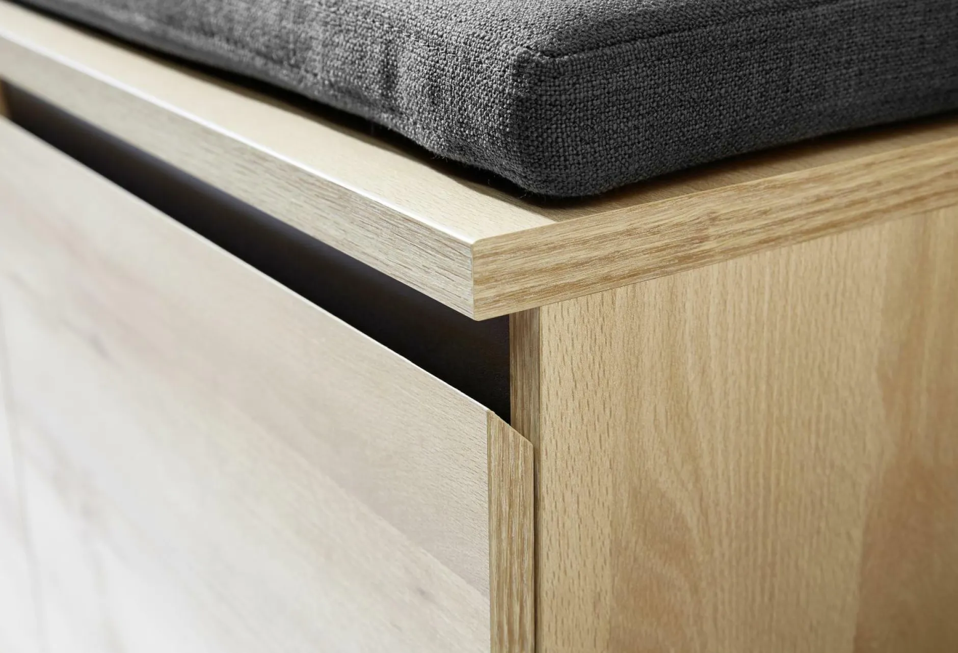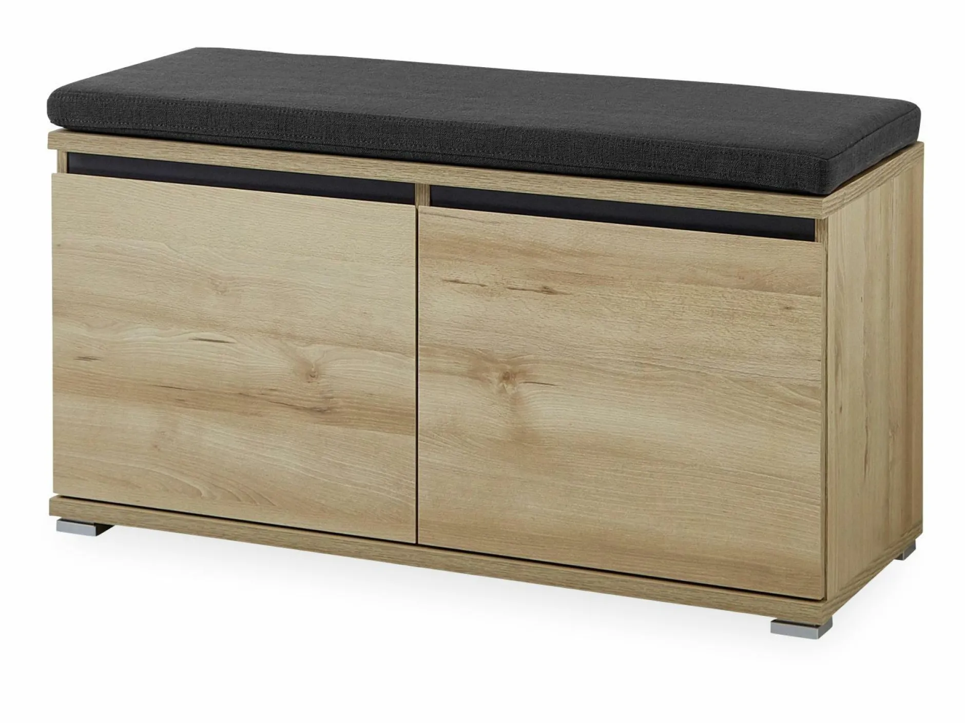 · Schuhbank mit zwei Türen, jeweils ein verstellbarer Einlegeboden (belastbar bis zu 10 kg), Oberboden kurzfristig belastbar bis zu 90 kg, Unterboden belastbar bis zu 20 kg, Edelbuche-Nb. mit Applikationen im Dekor Anthrazit, vier eckige Kunststofffüße, Türdämpfung, hochwertige ABS-Kanten, griffloses Design, Platz für ca. 8 Paar Schuhe, Made in Germany.