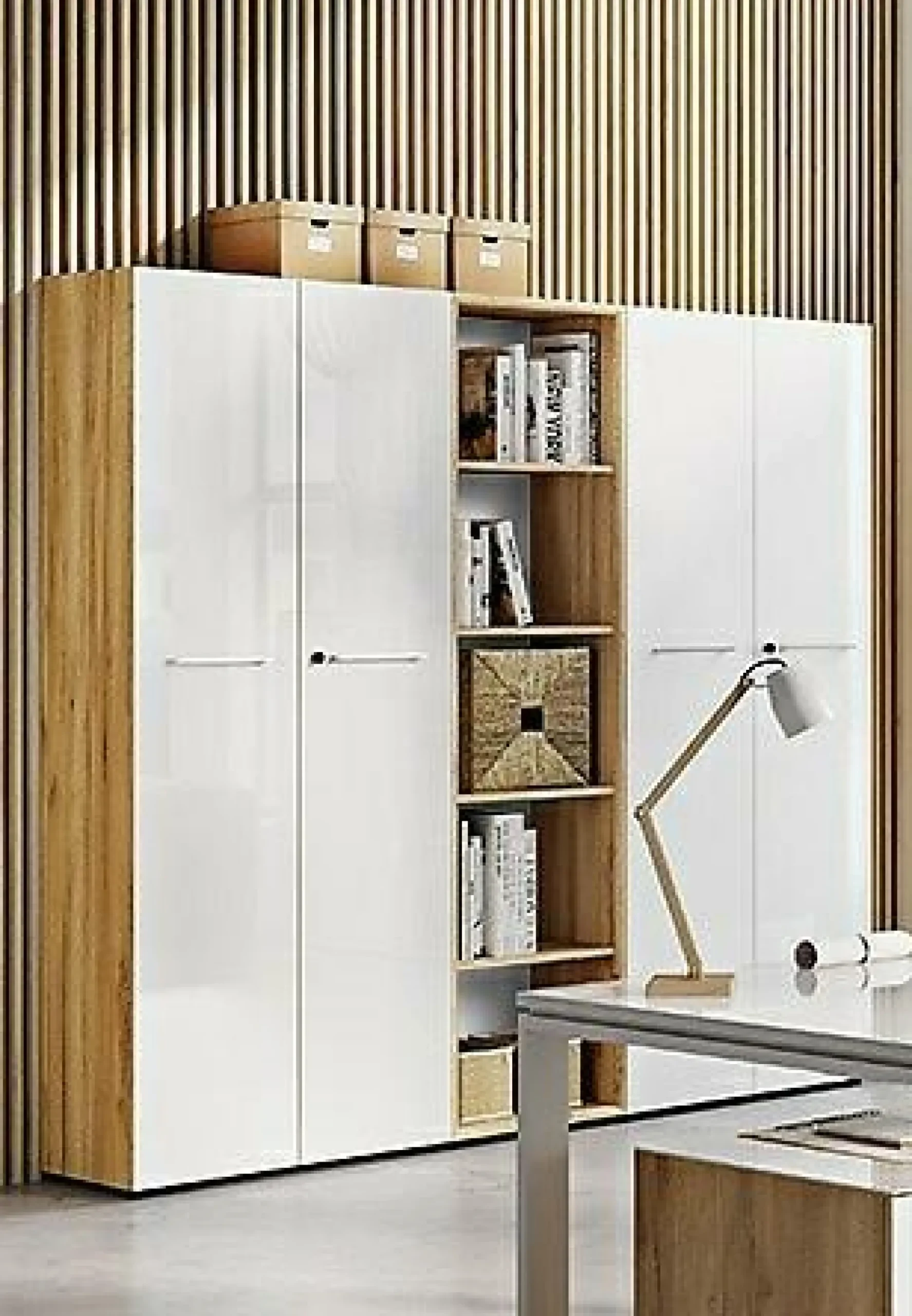 · Set bestehend aus zwei Aktenschränken (4204) BHT:80/196/37cm und einem Aktenregal (4205) BHT:50/196/37cm, Aktenschränke mit abschließbaren Türen, dahinter je vier feste Böden, Aktenregal mit vier festen Böden und 3D-Rahmen mit Gehrung MDF-ummantelt, insgesamt vier Relinggriffe aus Chrom und 12 schwarze Möbelgleiter, Fronten mit Glasauflage, Korpus in Navarra-Eiche-Nb., Glaselemente in Weiß, Türdämpfung, Melaminharzbeschichtung, hochwertige ABS-Kanten, Made in Germany.