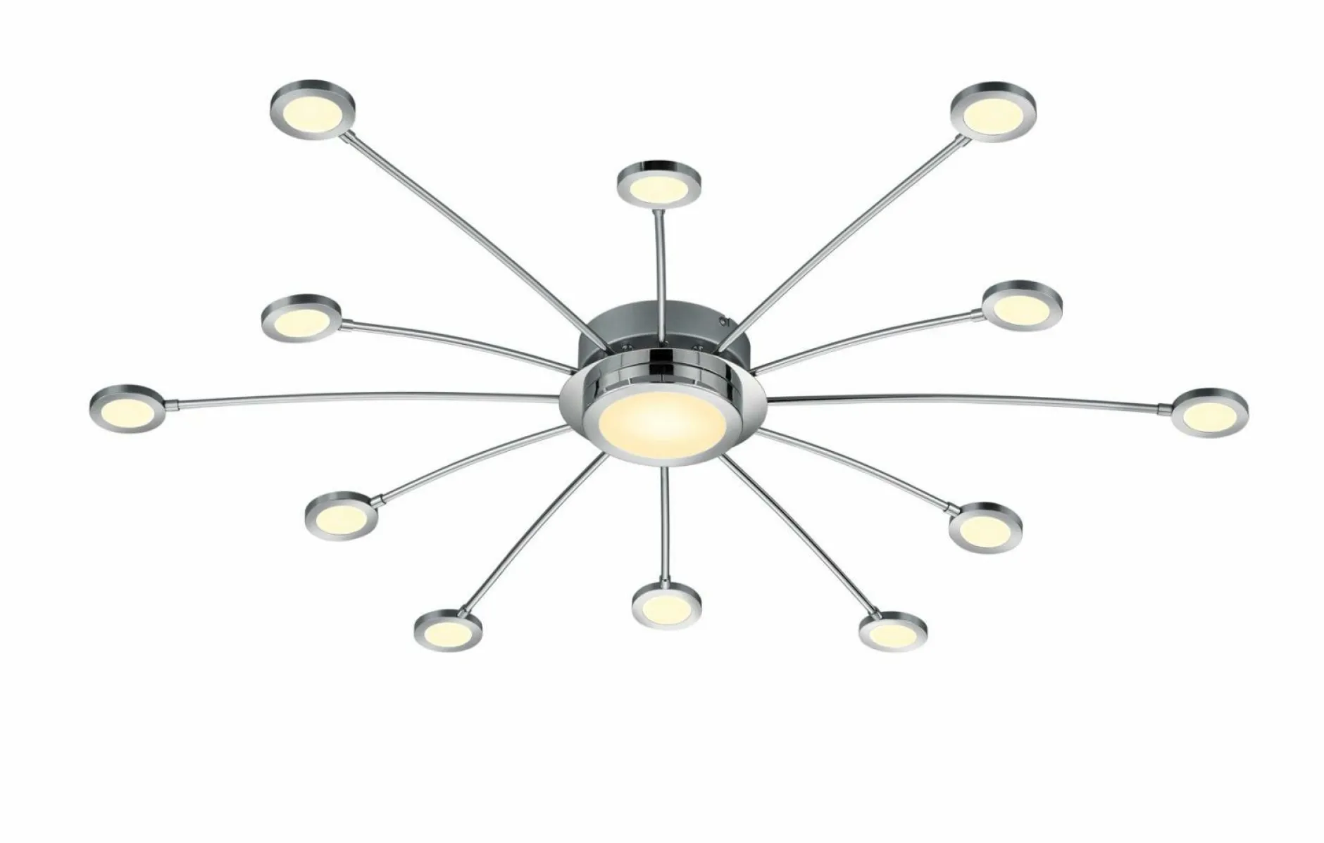 Durch den großzügigen Durchmesser von 100 cm und die vielen kleinen und großen Leuchtelemente, schafft die Deckenleuchte Bodrum sehr viel Licht in Ihrem Wohnraum. Aus Chrom gefertigt, wirkt die Lampe vor allem durch ihre spezielle Form sehr schick und modern. Durch die Fernbedienung ist die Deckenleuchte dimmbar und dazu können Sie auch noch die Lichtfarbe einstellen – zwei tolle Vorteile, die Ihnen viel Spaß bereiten werden und die Sie im Alltag enorm unterstützen werden. Ob Im Wohn-, Ess- oder Schlafzimmer – diese Deckenleuchte wird jeden Raum mit wunderschönem Licht versorgen und dazu noch ein schönes Accessoire sein.