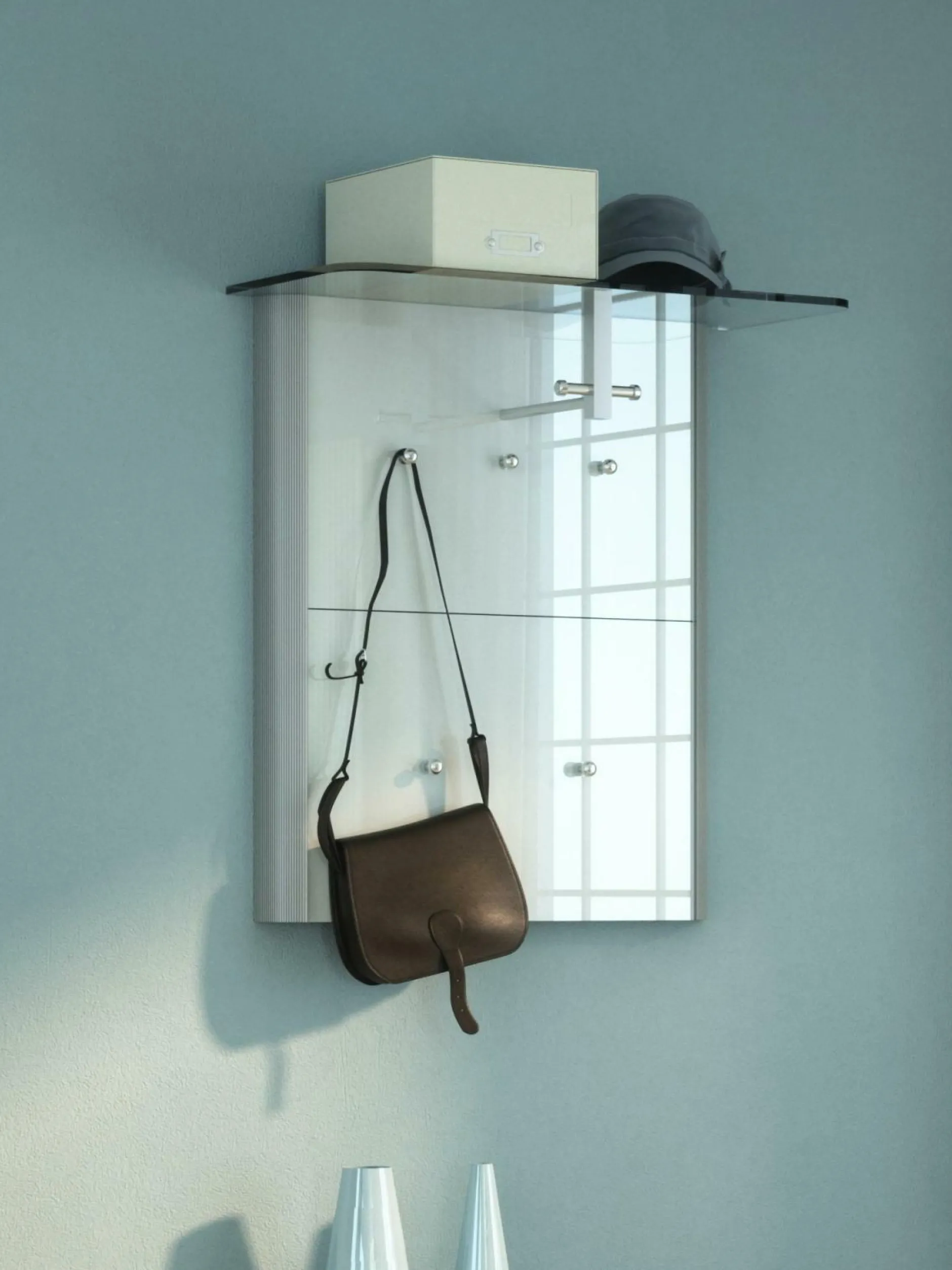 Die Garderobe Melodie 47 von ARREDOKIT sorgt für ein einladendes Gefühl beim Einkehren in das eigene Zuhause. Der Korpus des Elements ist alufarbig und wird von einer weißen Glasfront ergänzt. Silber-metallische Elemente wie eine Kleiderstange und mehrere Haken runden den edlen Look ab und bieten Stauraummöglichkeiten für Jacken, Mäntel und Zubehör. Auf einer Ablage finden Sie zusätzlichen Platz für Hüte und weitere Accessoires.