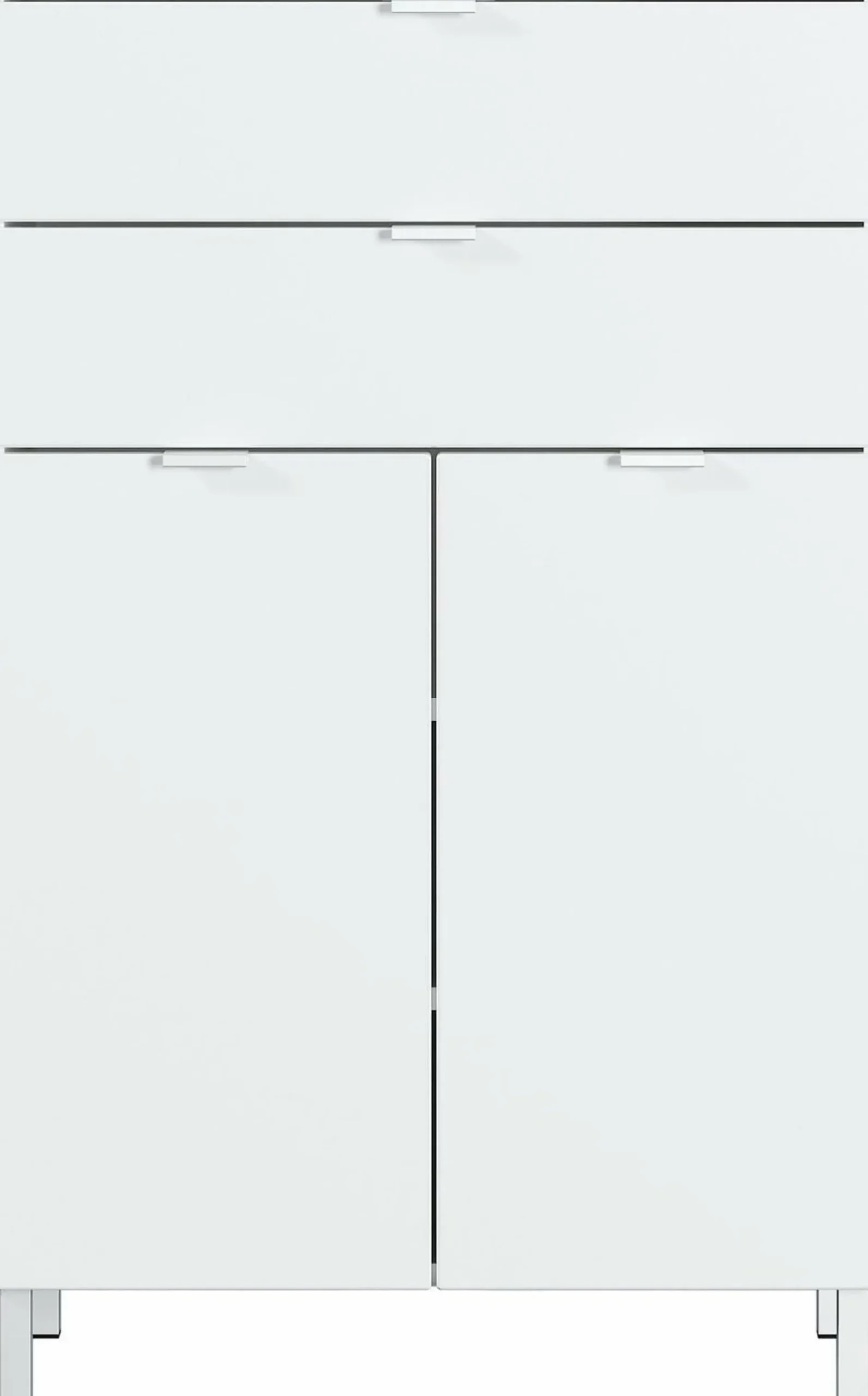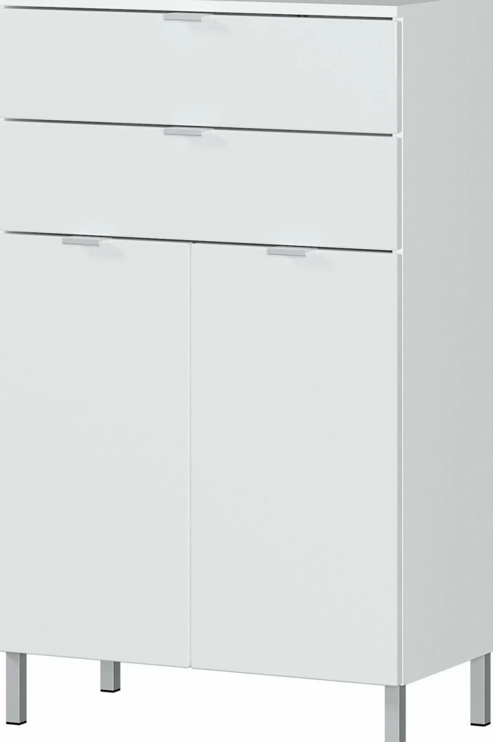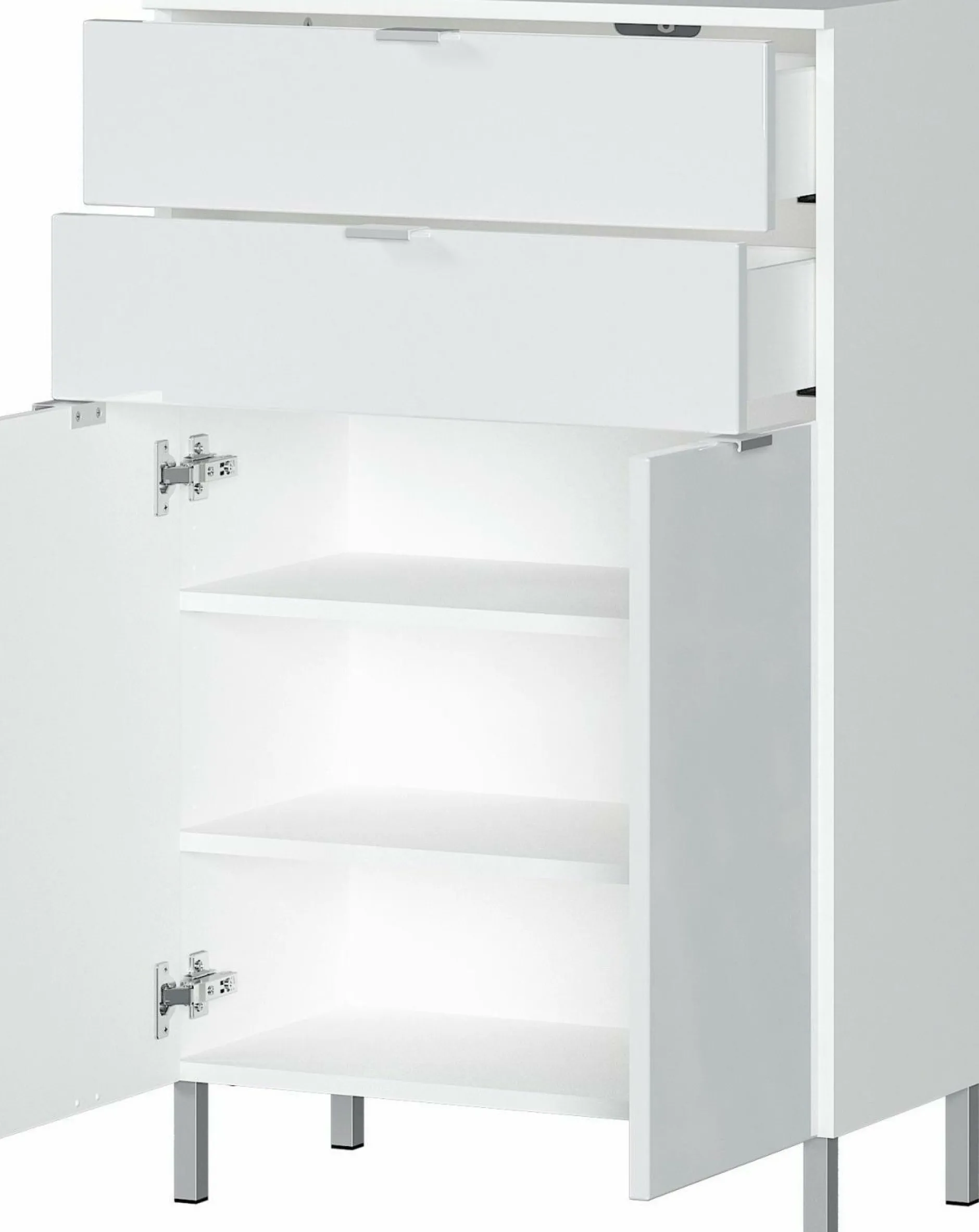· Kommode mit zwei Schubladen (belastbar bis zu 10 kg) und zwei Türen – dahinter zwei verstellbare Einlegeböden (belastbar bis zu 10 kg), Oberboden belastbar bis zu 10 kg, Korpus in Weiß, Fronten in Weiß, vier Kantengriffe und vier Füße aus Metall in der Farbe Chrom,Korpus Melaminharzbeschichtung, hochwertige ABS-Kanten, Fronten MDF-tiefgezogen und hochglänzend, Türdämpfung, Selbsteinzug der Schubladen, Made in Germany
