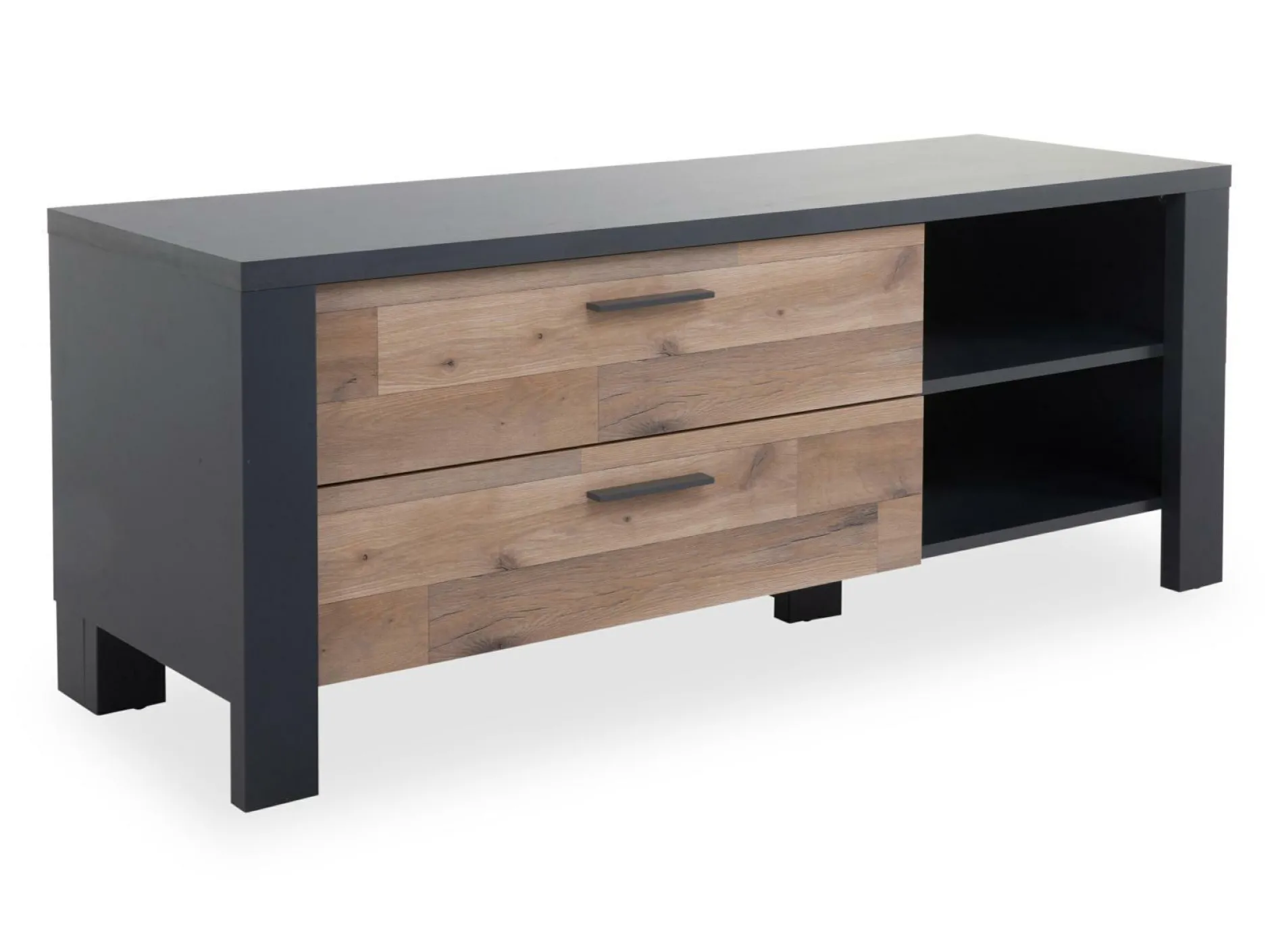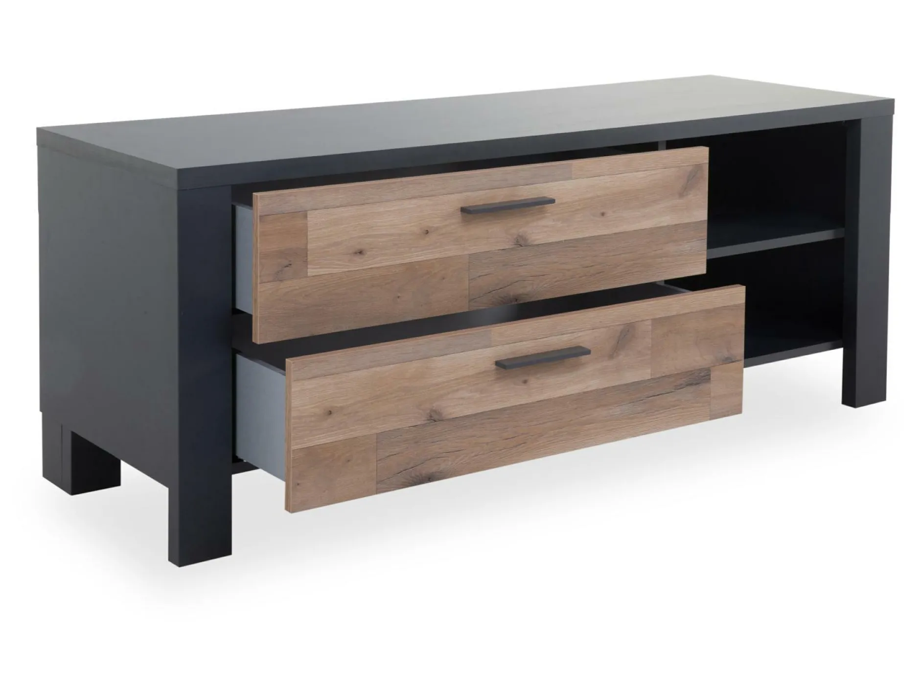 · mit zwei Schubladen und zwei offenen Fächern