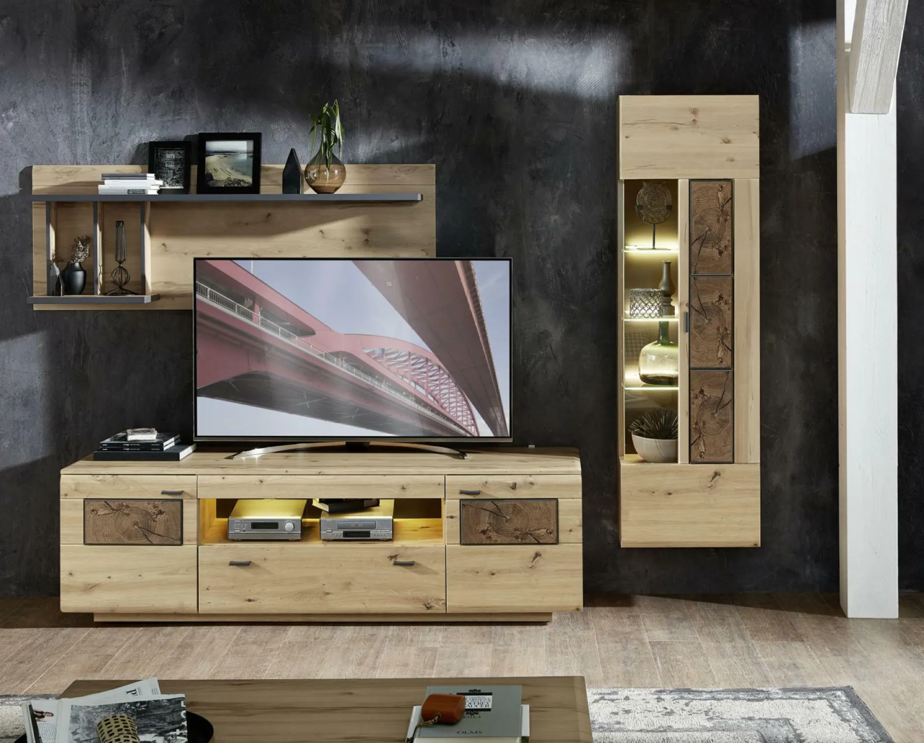 Mit dem Lowboard Lavado aus dem Hause vito verbinden Sie Stilbewusstsein mit Ordnung und Platz. Das wohnliche Design ergänzt nahezu jedes Wohnkonzept und schafft dabei ein kleines Highlight in Ihrem Wohnbereich. Sowohl der Korpus als auch die Front sind aus Artisan Eiche Nachbildungen gefertigt. Die Front wird dabei durch Absetzungen aus Hirnholz vervollständigt. Die Griffe aus graphitfarbigem Metall runden den Gesamtlook perfekt ab. Damit Sie das Zubehör für Ihren Fernseher kinderleicht verstauen können, ist die Kommode mit zwei Holztüren, einer Schublade und einem offenen Fach ausgestattet. Damit Sie Ihr liebstes Hab und Gut gekonnt in Szene setzen können, ist auf Wunsch Beleuchtung erhältlich.
