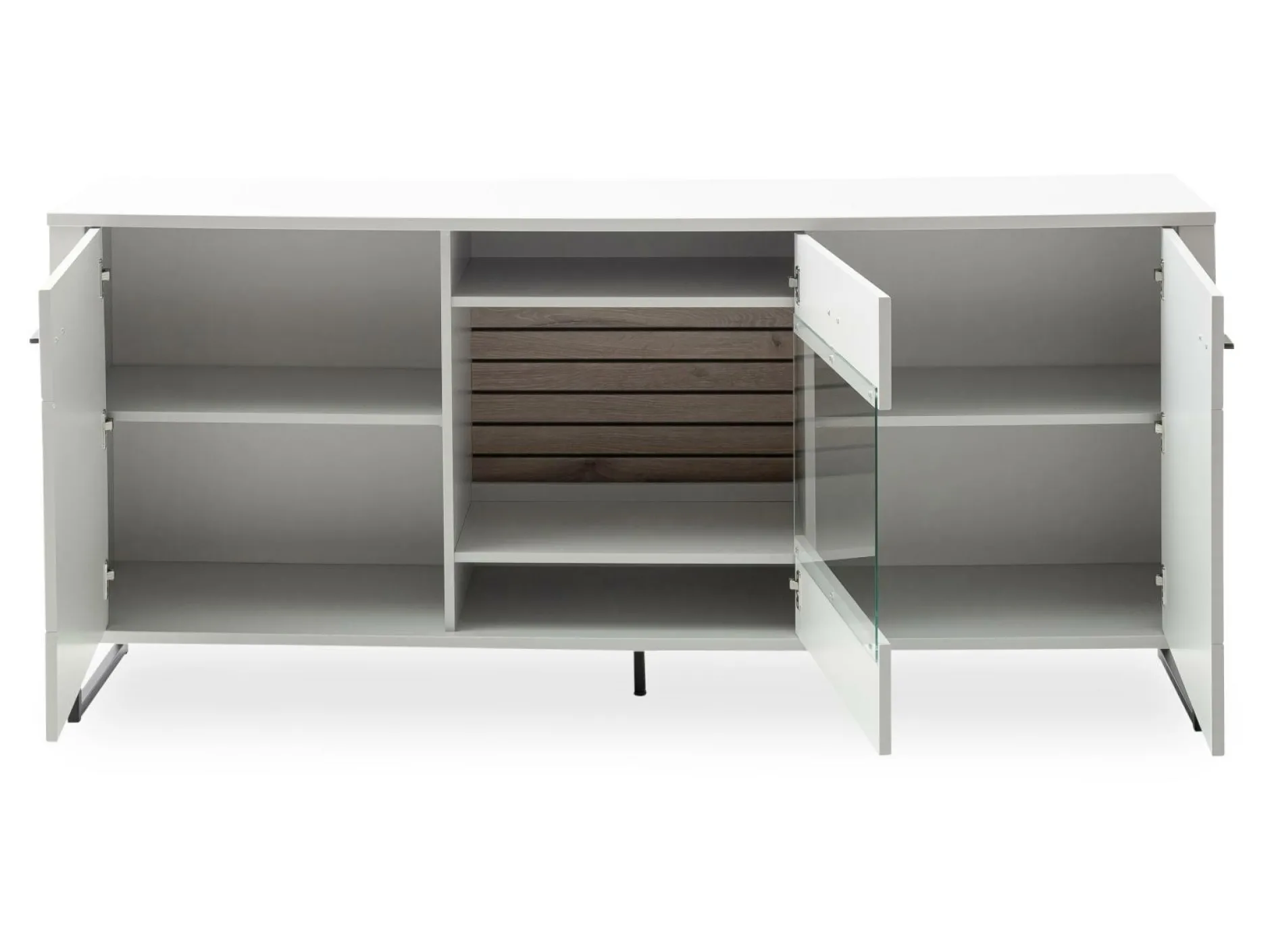 Das Sideboard MATEO von MCA vereint modernes Design mit praktischem Stauraum. Die Front aus weißem Dekor verleiht dem Ganzen eine schlichte Eleganz. Die Griffe und Kufen aus anthrazitfarbenem Metall unterstreichen den hochwertigen Look. Es besteht aus zwei Türen und einer Glastür. Die vier Holzböden sorgen für eine stilvolle und strukturierte Aufbewahrung. Auf Wunsch ist eine LED-Bandbeleuchtung erhältlich, die das Sideboard subtil in Szene setzt.