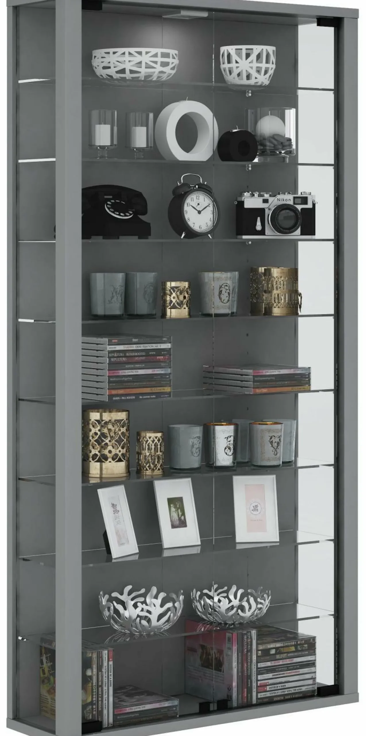 · VCM Vitrine Vitrosa Maxi ohne LED-Beleuchtung. Das Grundgerüst besteht aus Holz mit einer stabilen Rückwand. Mit 8 Einlegeböden, die Seitenteile und Glastüren bestehen aus ESG-Sicherheitsglas. Einfache Wandmontage möglich. Die Lieferung erfolgt zerlegt inkl. Montageanleitung und Montagematerial. Holzstruktur-Nachbildung. Produktmaße: Höhe 118 x Breite 59 x Tiefe 18 cm
