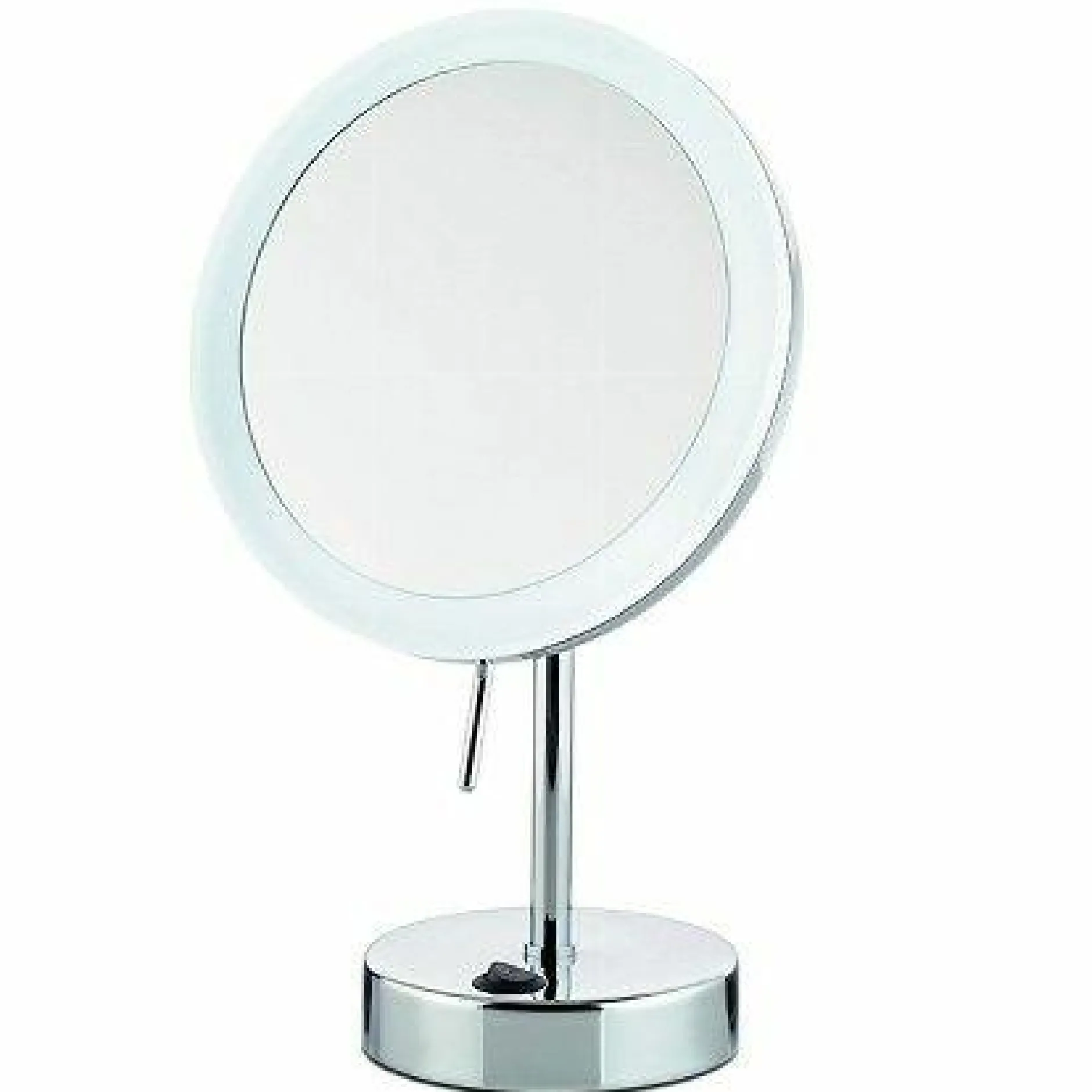 Mit dem Standspiegel Sabine von kela wird das Schminken und Frisieren zu einem optimal ausgeleuchteten Erlebnis. Er besteht aus verchromtem Zinkdruckguss und kommt mit einem praktischen Schalter auf dem Fuß. Der Spiegel ist 31,5 cm hoch und die Spiegelfläche hat einen Durchmesser von 20cm. Er vergrößert 5fach, sodass Sie sich im Detail betrachten können.