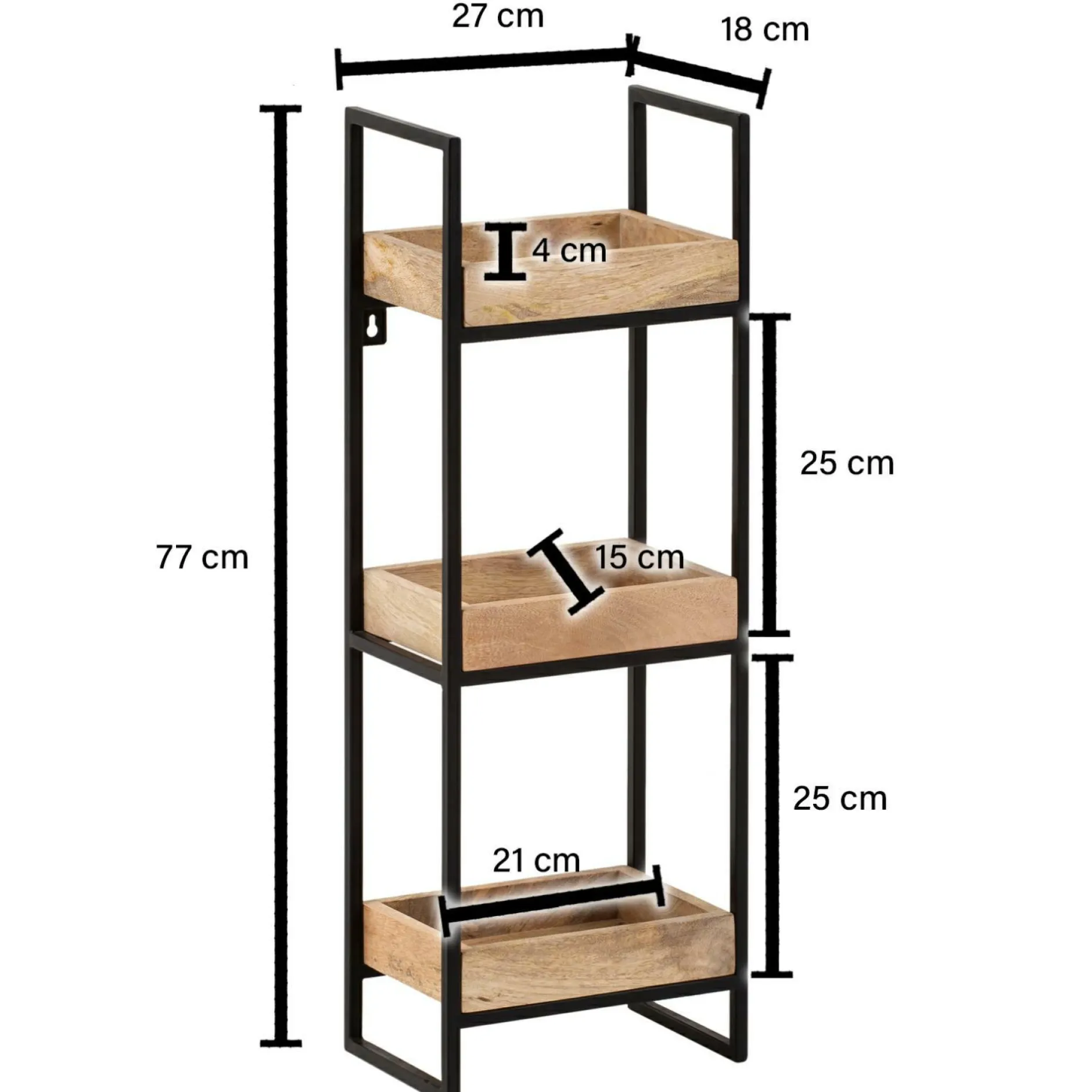 · Abmessungen – Abmessungen je Tablett (BxHxT): 21 x 4 x 15 cm, Holzstärke: ca. 1,5 cm, Metallstärke: 1 cm.