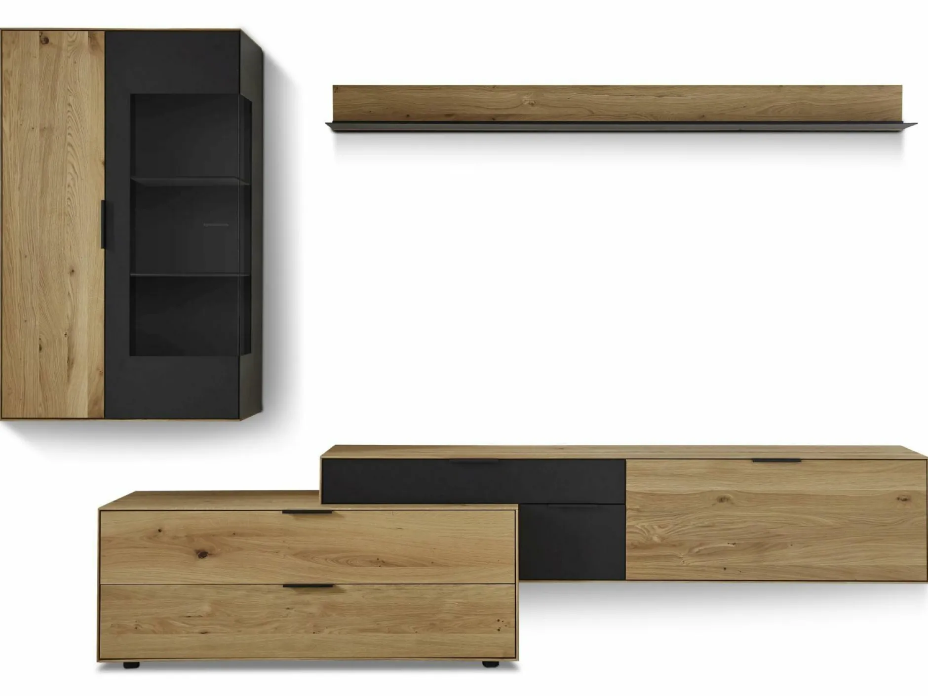 · Wand best. aus: Lowboard mit 2 Schubladen Aufsatzelement mit 1 Klappe und 2 Schubladen, Hängevitrine mit 1 Glastür, 1 Holztür