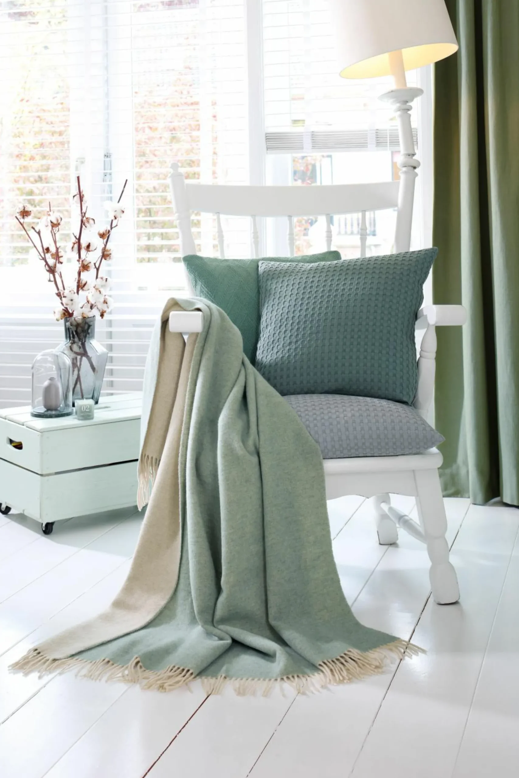 · Diese luxuriöse Kaschmirdecke aus edlem Wolle-Kaschmir-Mix vereint Eleganz und Gemütlichkeit mit einem modernen Doubleface-Look in Grün und Beige. Die Fransen sind in derselben Farbe gehalten wie die Rückseite der stylishen Wolldecke. Die hochwertige, zweiseitige Wohndecke setzt auch als Sofadecke besondere Akzente in der Einrichtung. Exklusiver kann eine Kuscheldecke nicht sein.