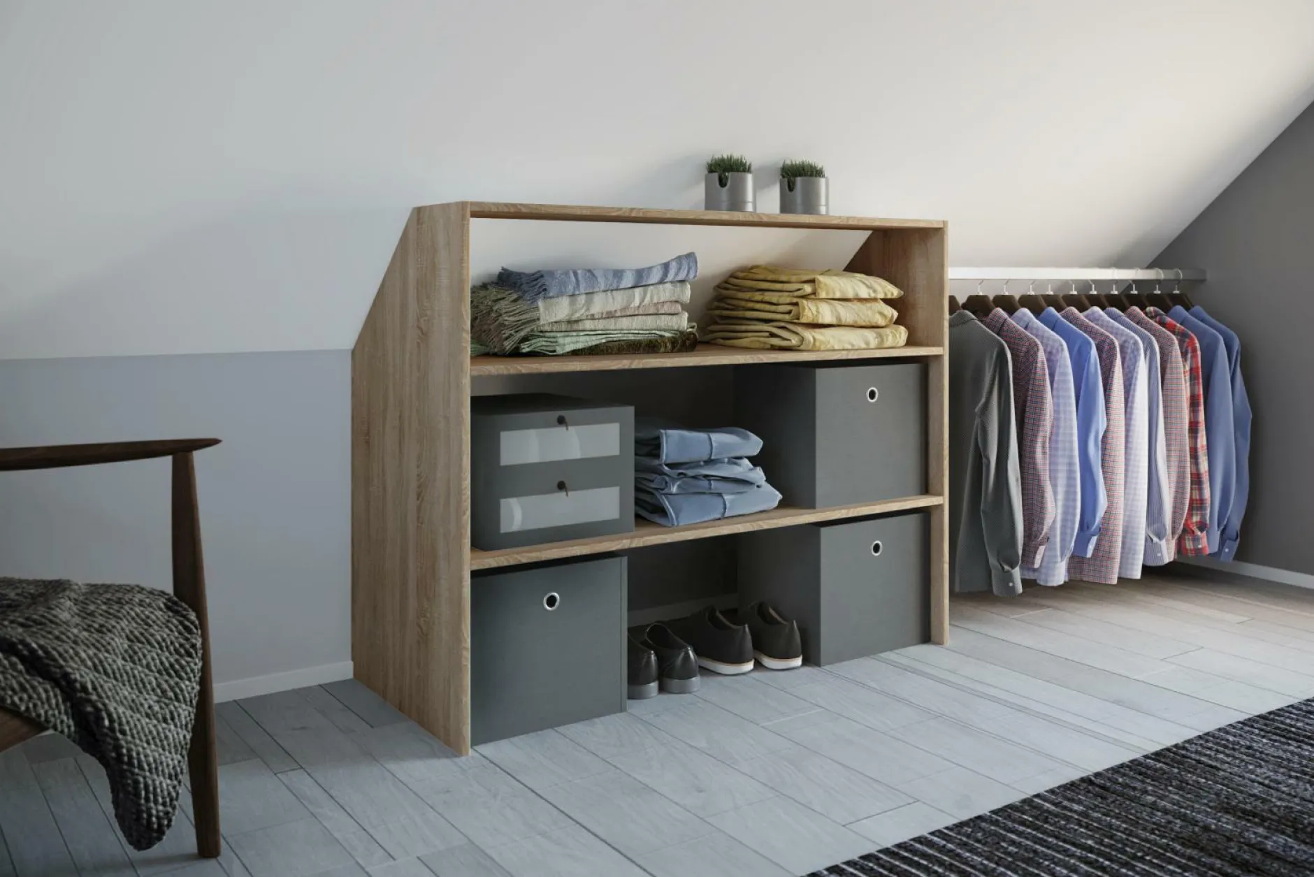 · 110 cm dem Platzbedarf anpasst. Das Regal ist ab der Höhe von ca. 65 cm leicht abgeschrägt, was dem Möbel ein besonderes Design gibt und gleichzeitig die ideale Lösung für Dachschrägen ist.