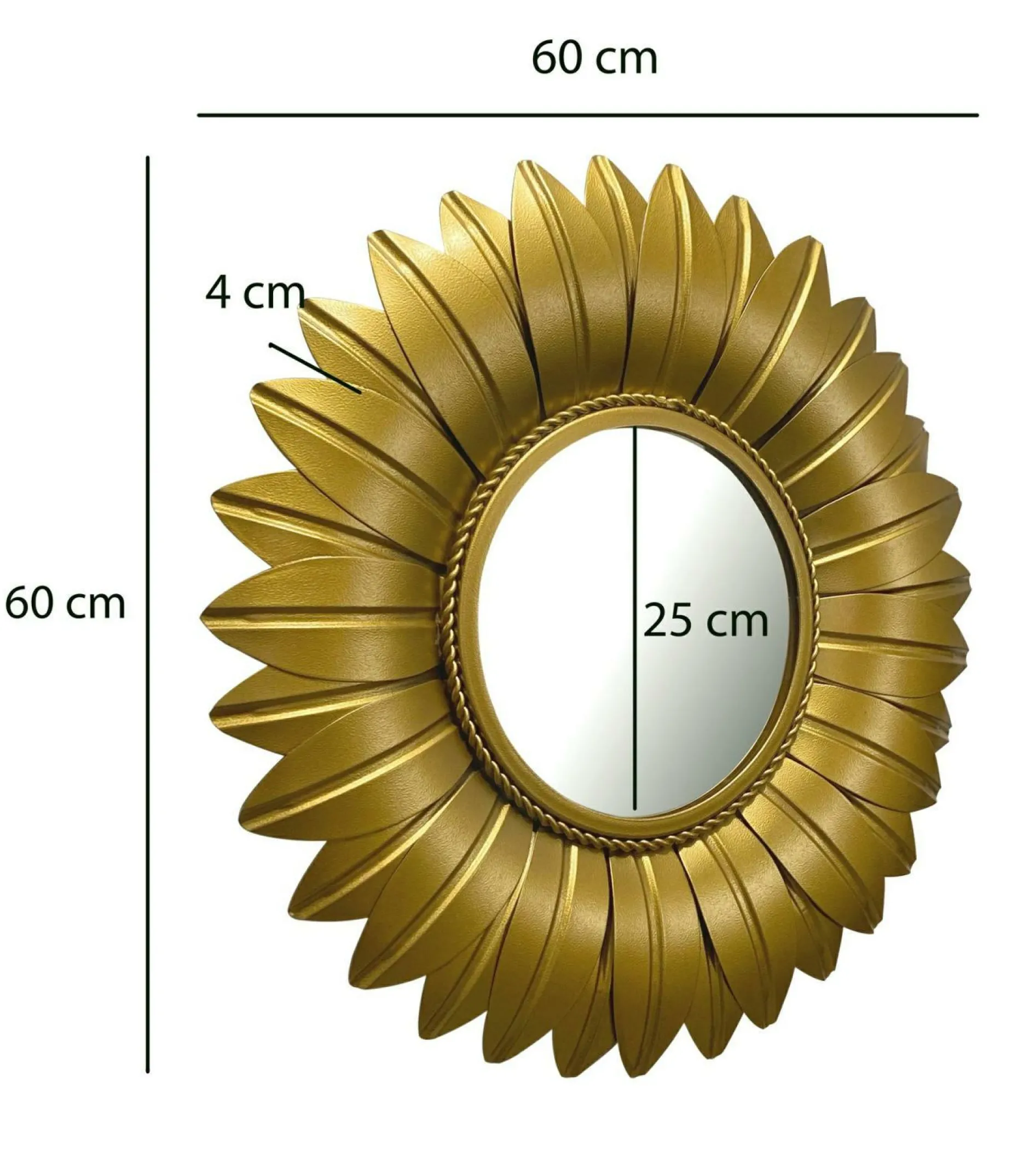 · Abmessungen – Breite: 60 cm // Höhe: 60 cm // Tiefe: 4 cm // Durchmesser Spiegel: 25 cm // Stärke der Spiegelfläche: 6 mm.