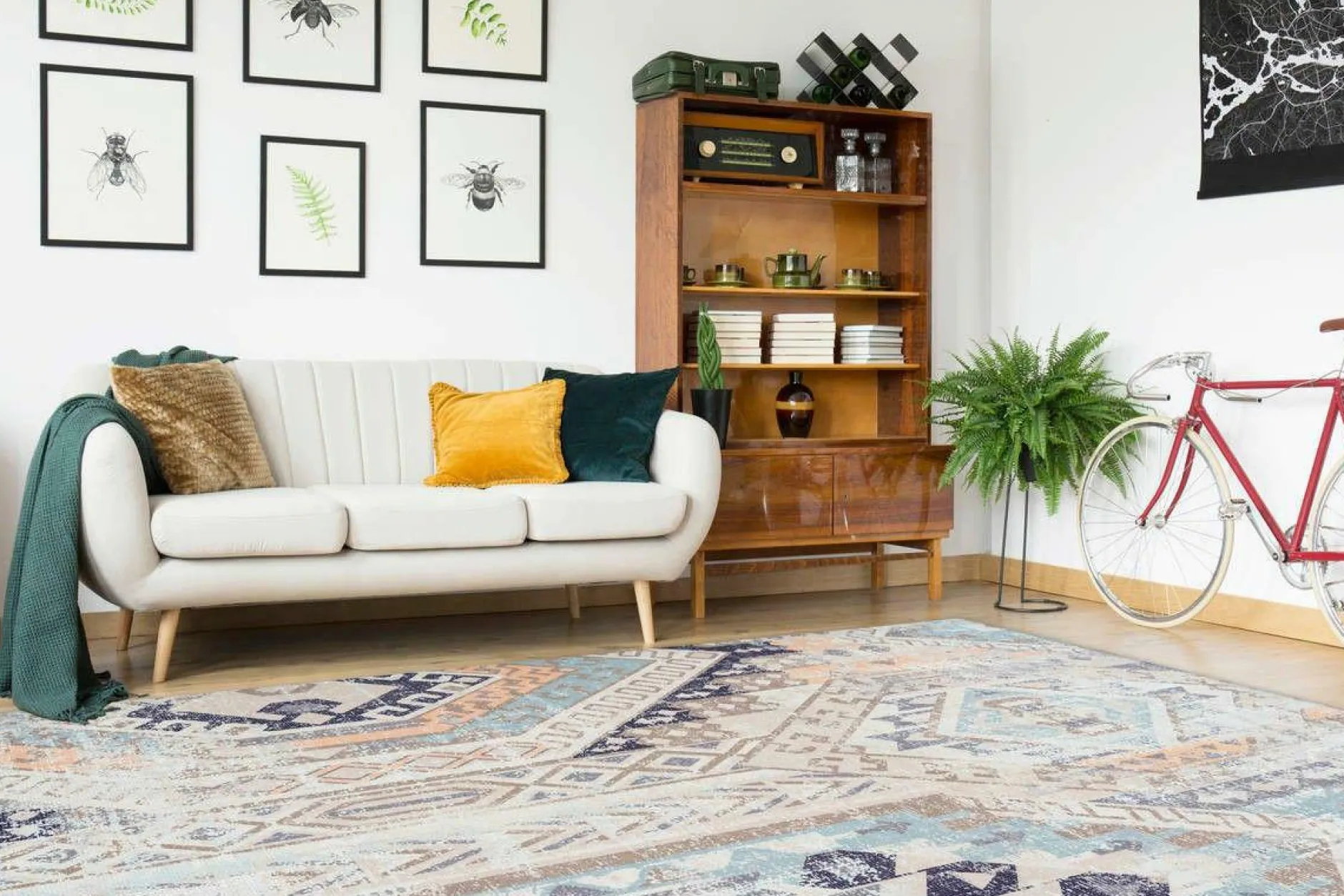 · Dieser Teppich mit flachem Flor wird durch das geprintete Vintage-Design zum Blickfang in jedem Wohnbereich. Das Muster vereint einen attraktiven Ethno-Style mit für den Vintage-Stil typischen Verwaschungen und sorgt so für einen besonderen Look. Durch die Kombination mit attraktiven Wohnaccessoires wie Sitzpoufs oder Sofakissen im Vintage-Stil können Sie das Einrichtungskonzept verstärken und Ihren ganz individuellen Style einbringen.