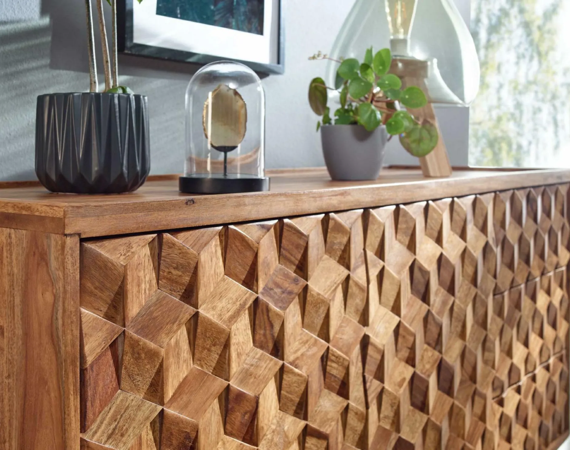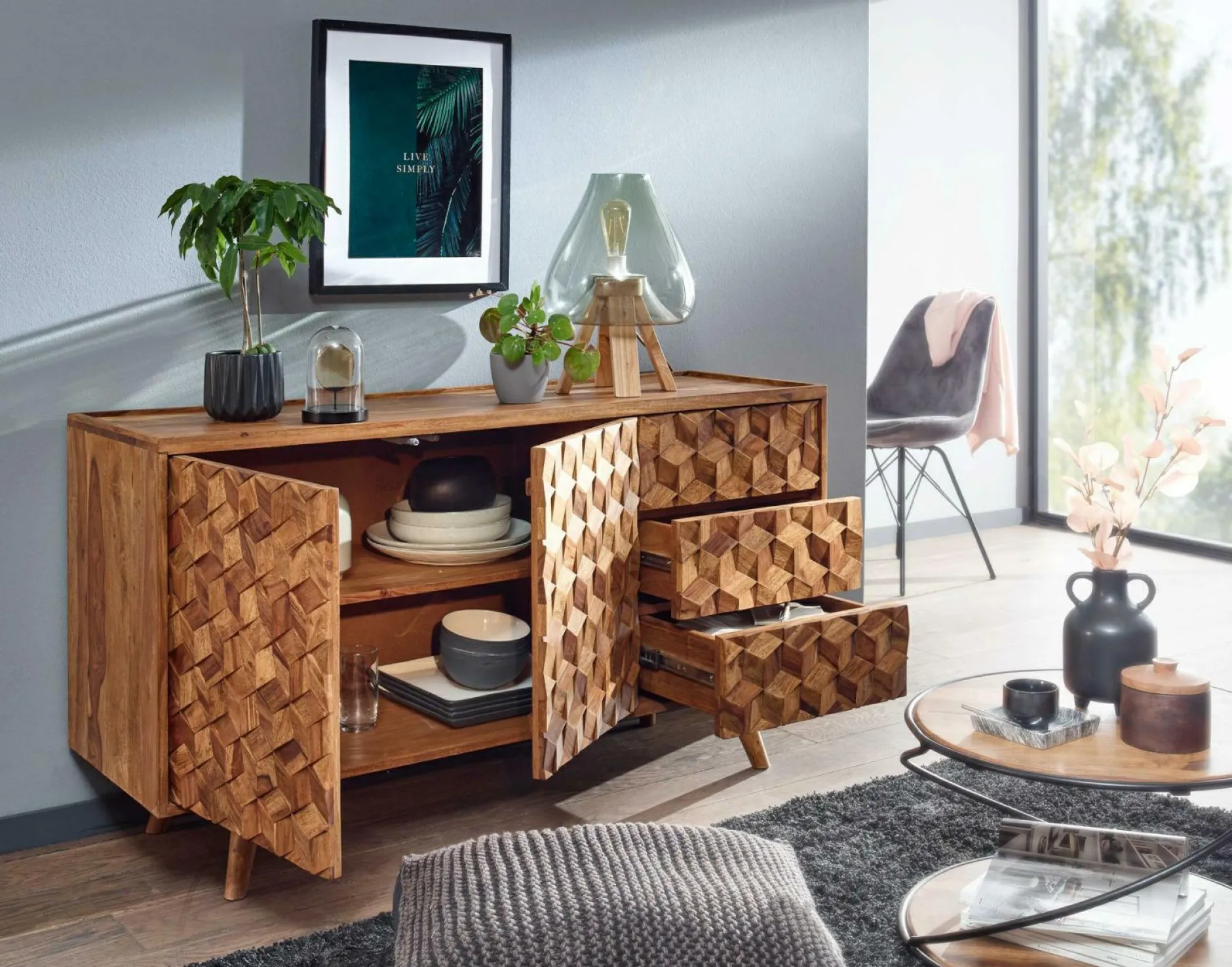 · Lieferumfang – Ein Sideboard ohne Dekoration. Montagematerial und -anleitung liegen der Lieferung bei.
